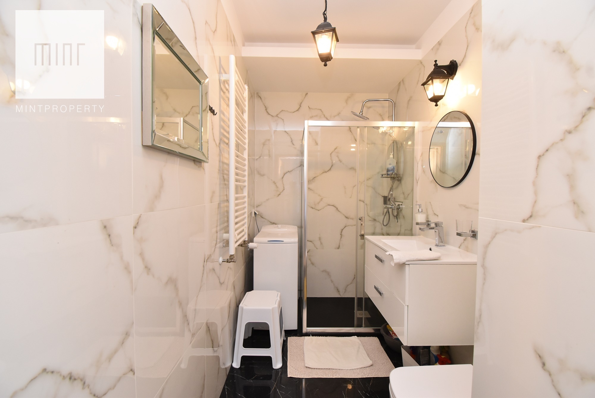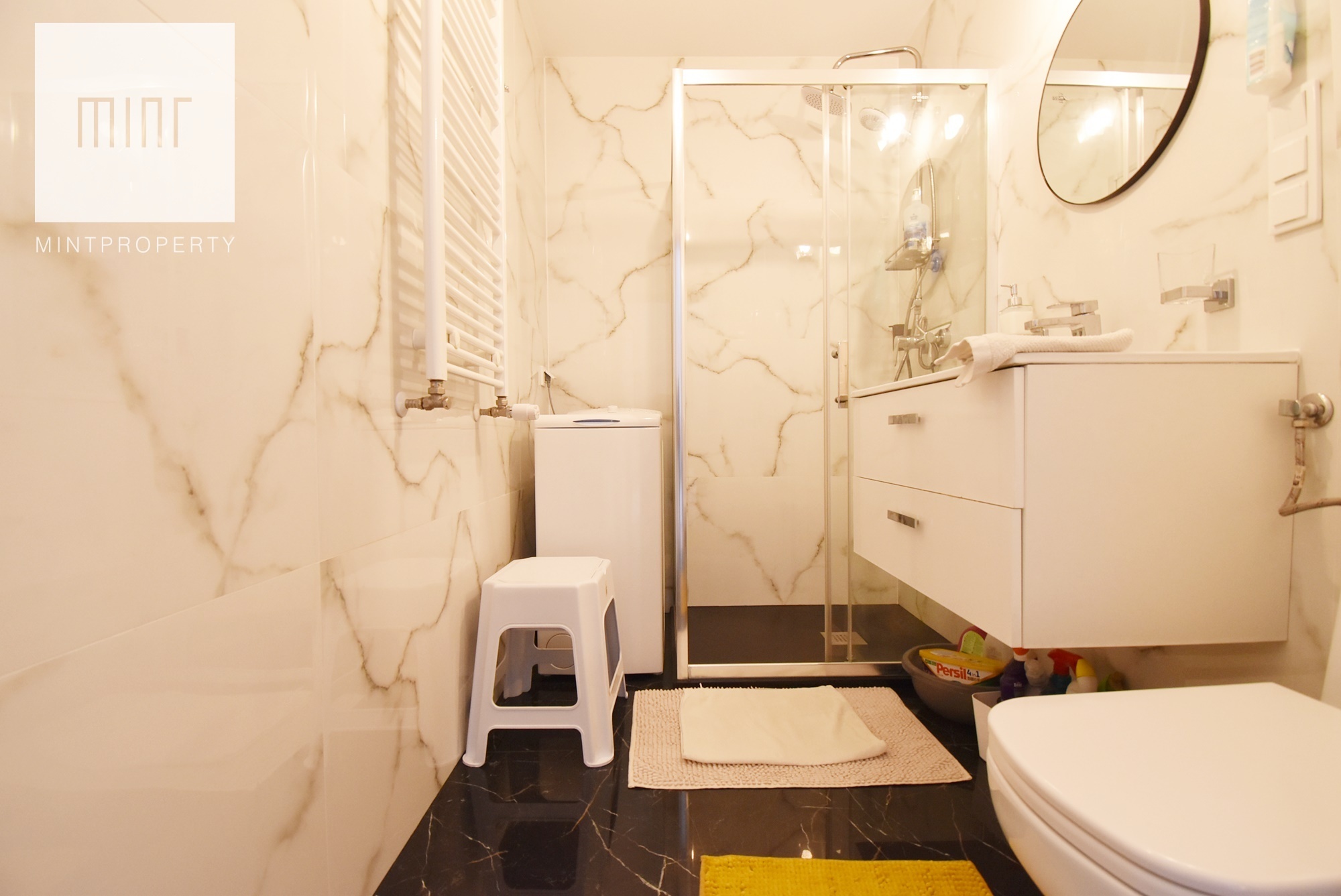 Bathroom with toilet: shower, washing machine.