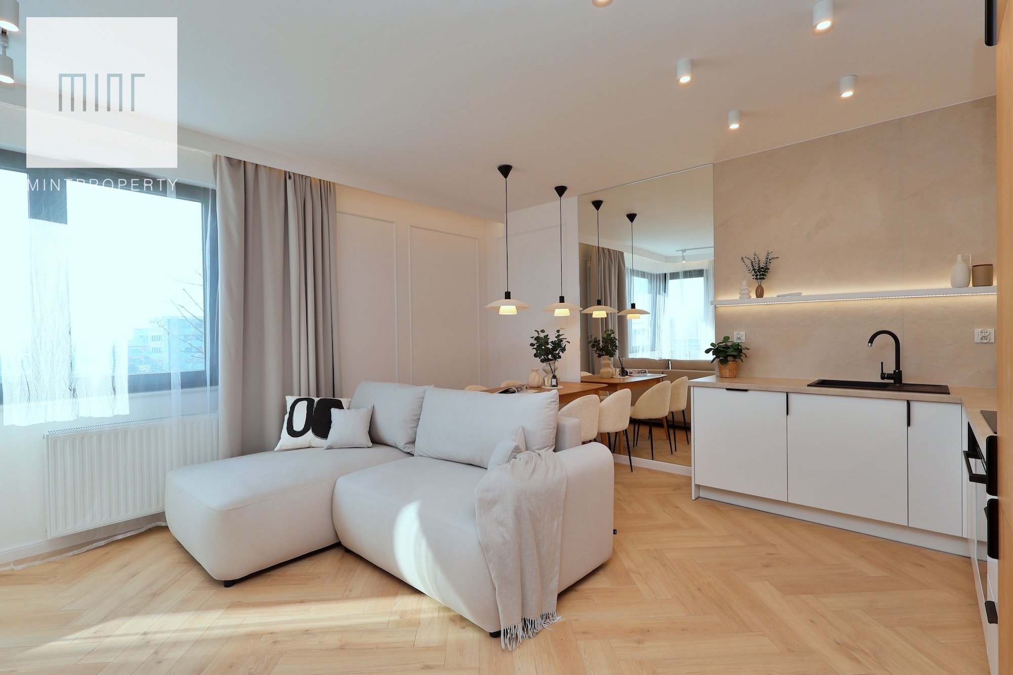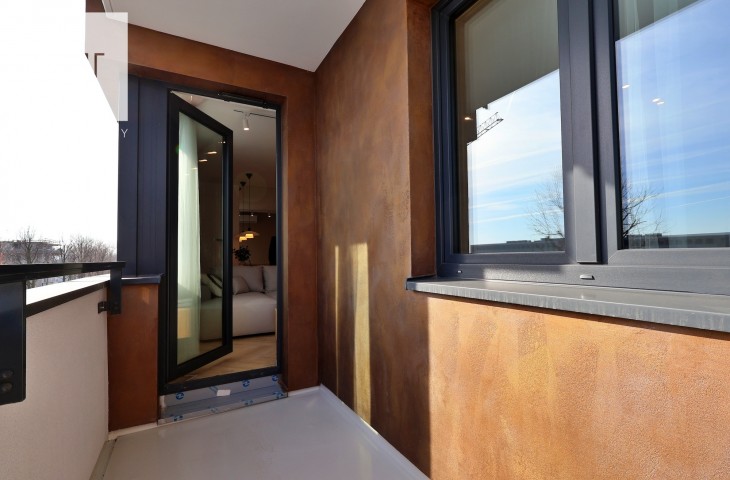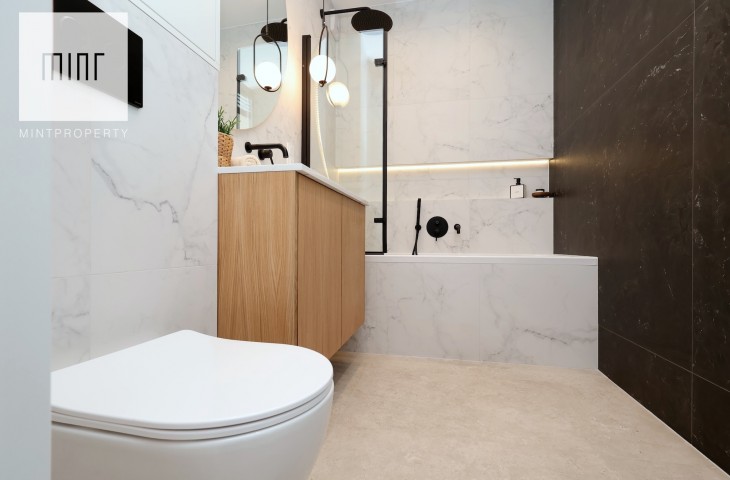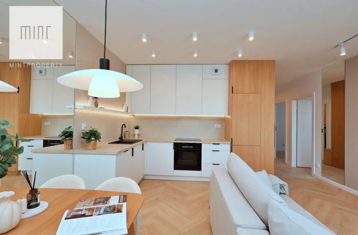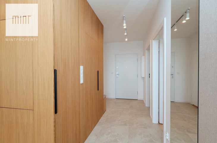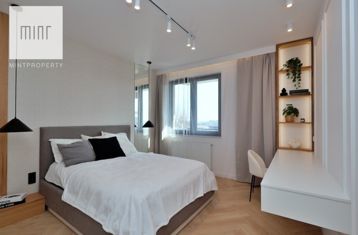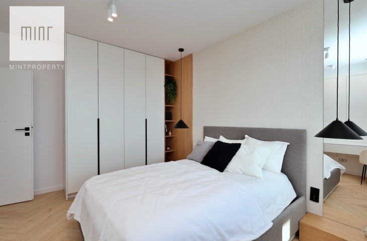 A parking space in the underground garage is available at an additional cost. The interior, designed by an architect in a modern classic style, combines timeless elegance with modern functionality. High-quality materials selected by the architectural office, custom-made furniture by a carpenter, and Bosch appliances: refrigerator, dishwasher, oven, and induction hob. The apartment features comfortable upholstered furniture – a sofa, chairs, a built-in bed with a dressing table – and decorative LED lighting in the living room cornice, under the kitchen cabinets, behind the bathroom mirror, and by the desk in the bedroom.