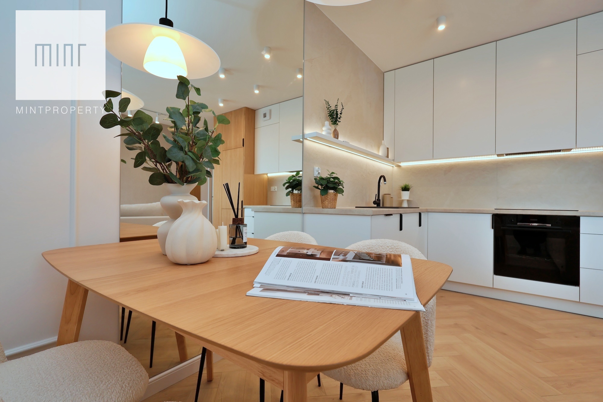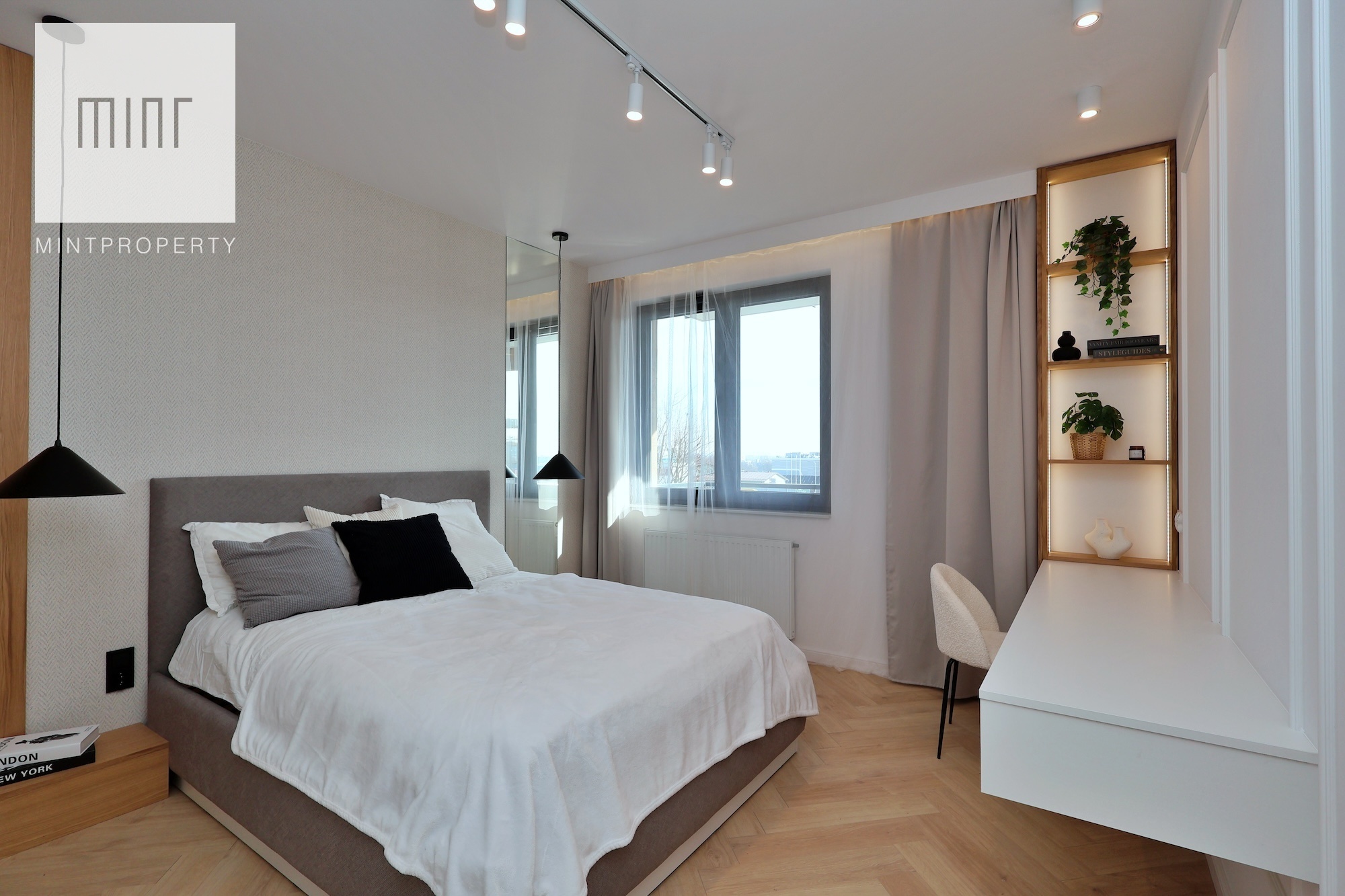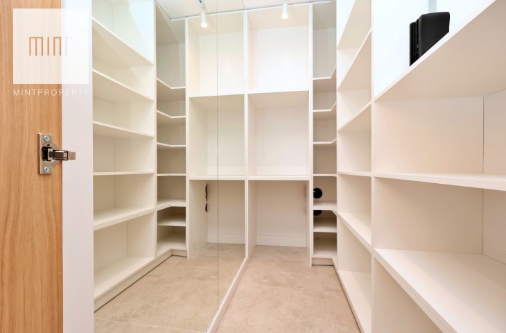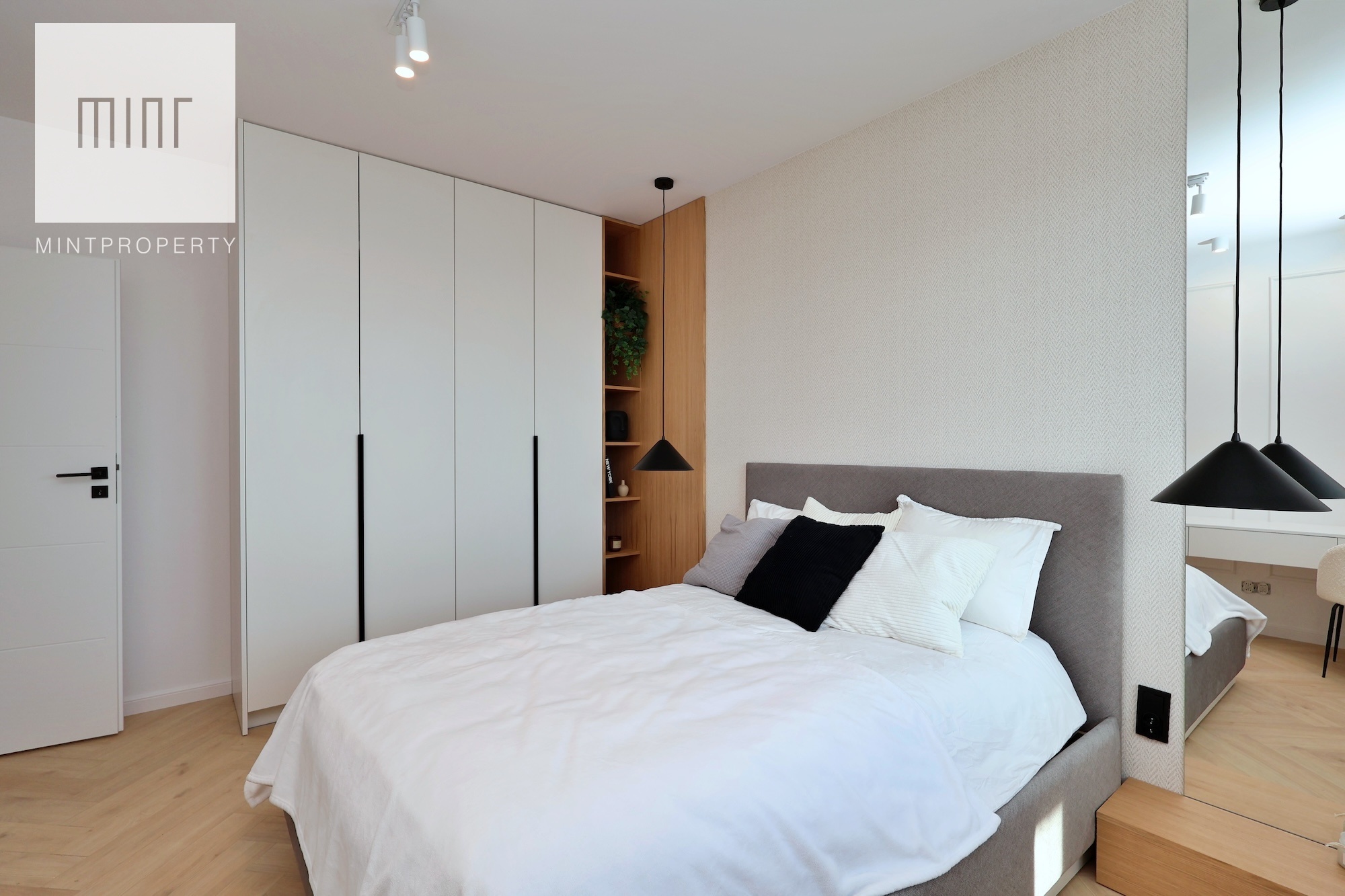 A parking space in the underground garage is available at an additional cost. The interior, designed by an architect in a modern classic style, combines timeless elegance with modern functionality. High-quality materials selected by the architectural office, custom-made furniture by a carpenter, and Bosch appliances: refrigerator, dishwasher, oven, and induction hob. The apartment features comfortable upholstered furniture – a sofa, chairs, a built-in bed with a dressing table – and decorative LED lighting in the living room cornice, under the kitchen cabinets, behind the bathroom mirror, and by the desk in the bedroom.