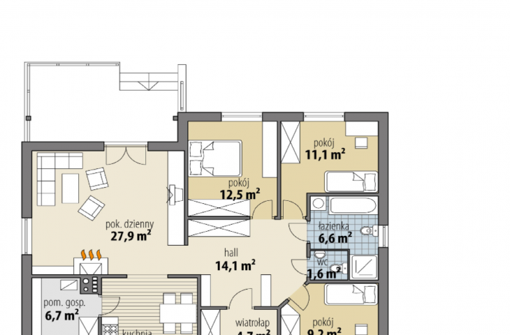 Zestawienie pomieszczeń: przedsionek, hall, salon z jadalnią, kuchnia, spiżarka, łazienka, 3 sypialnie