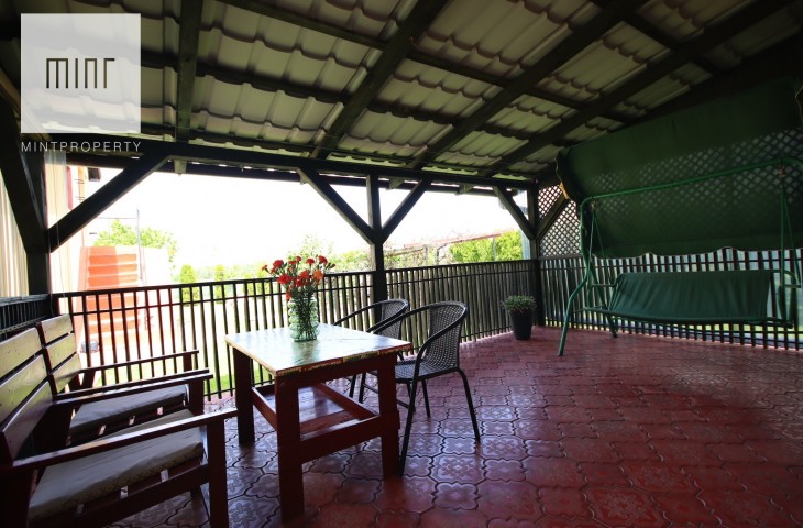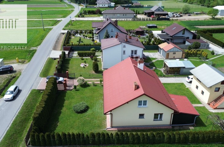 Dom docieplony z elewacją, kryty blachą. Nieruchomość jest ogrodzona, z brama automatyczna na pilota, ogród z licznymi nasadzeniami, duży zadaszony taras, podjazd z kostki brukowej.