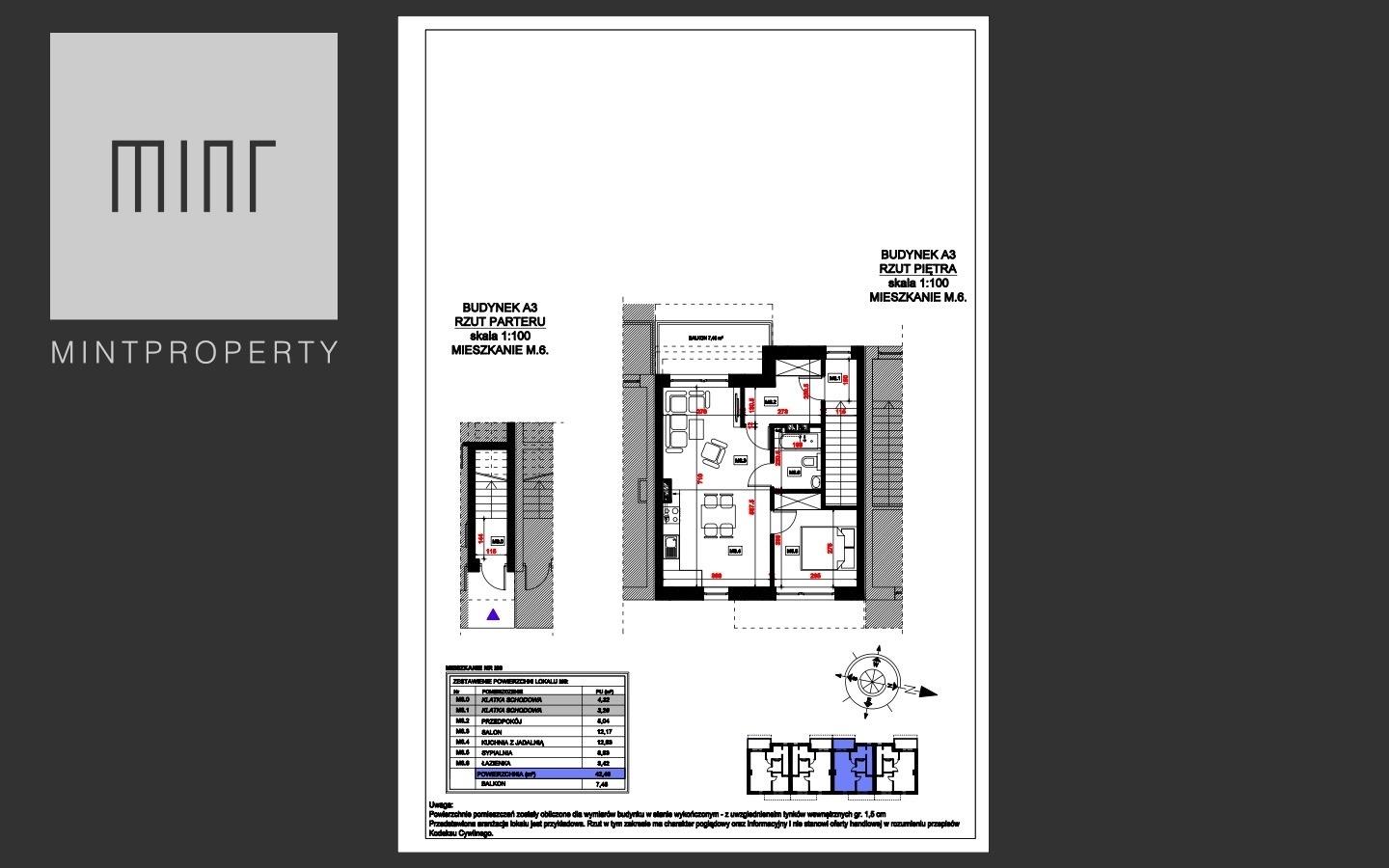 Prezentowany apartament położony na I piętrze (a3) o powierzchni 42,49 mkw :