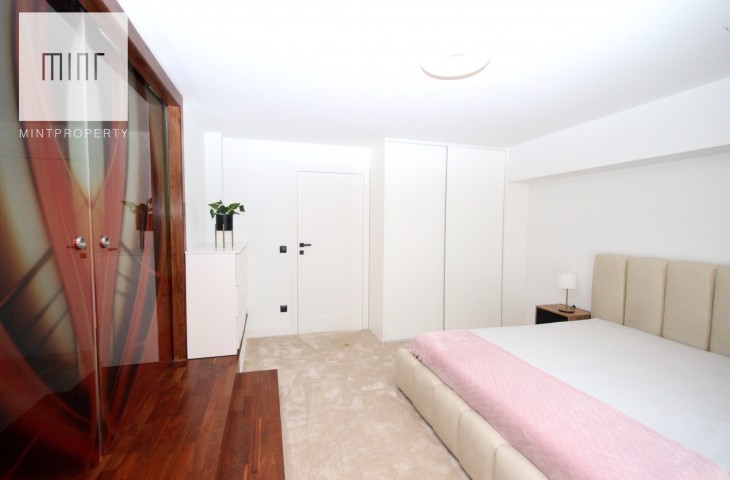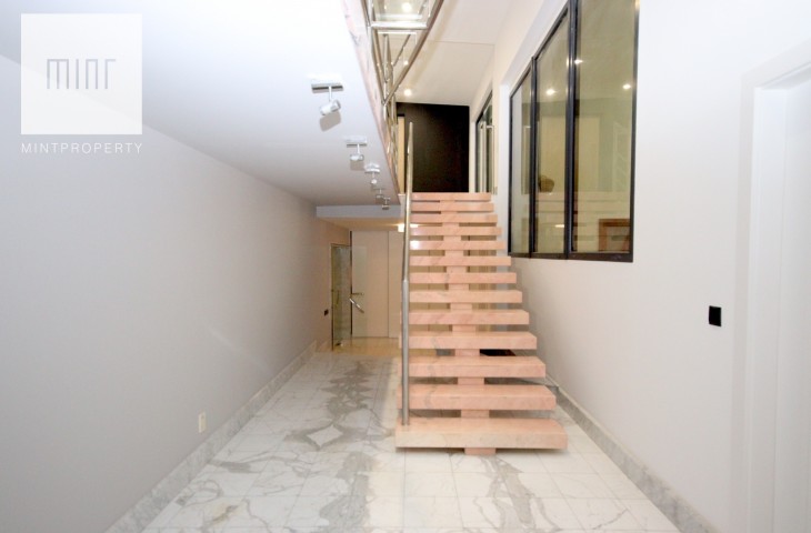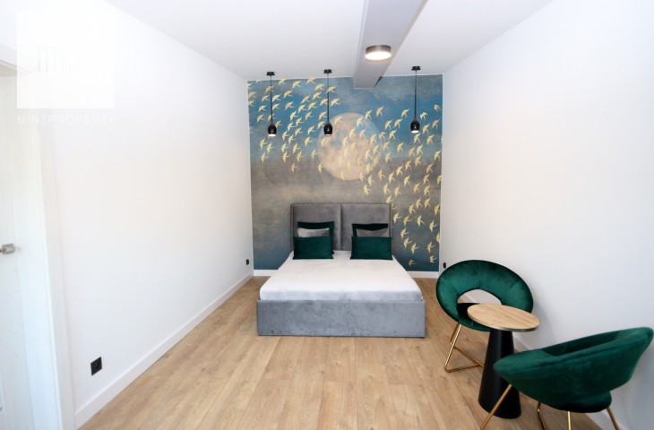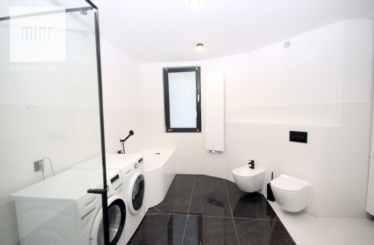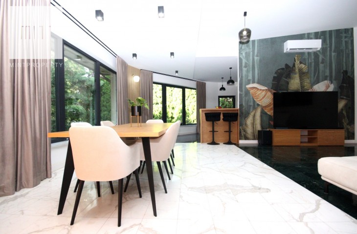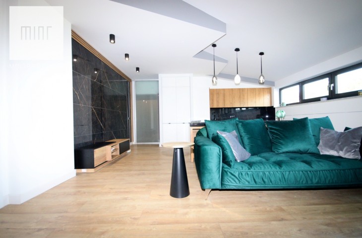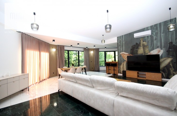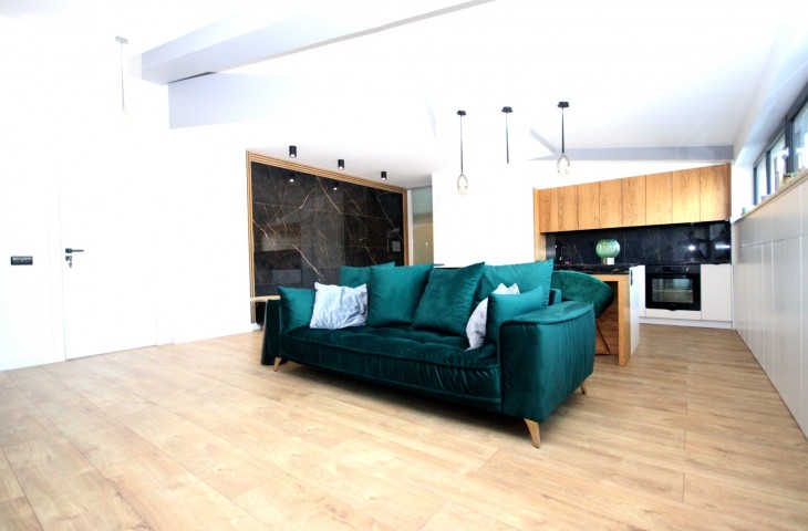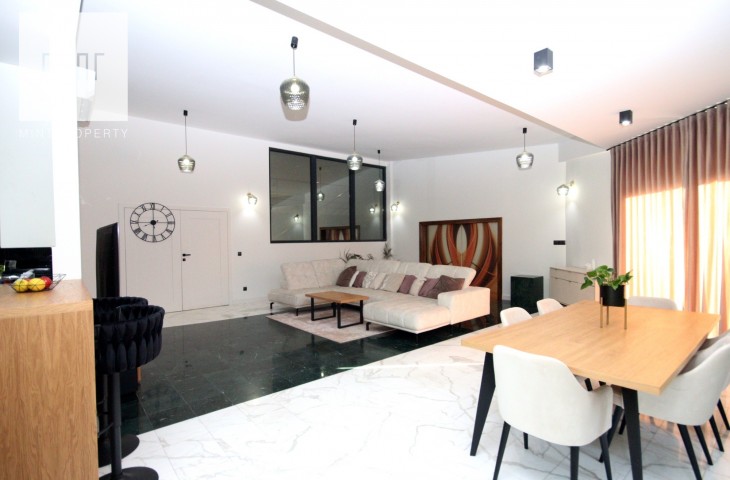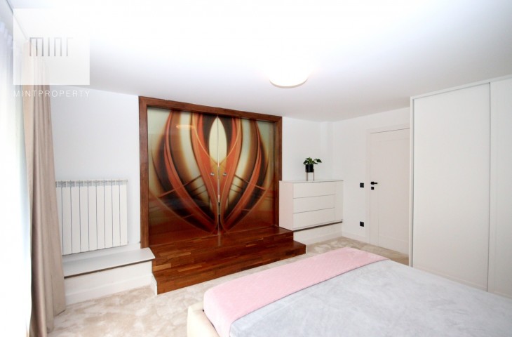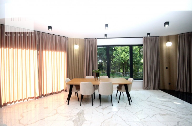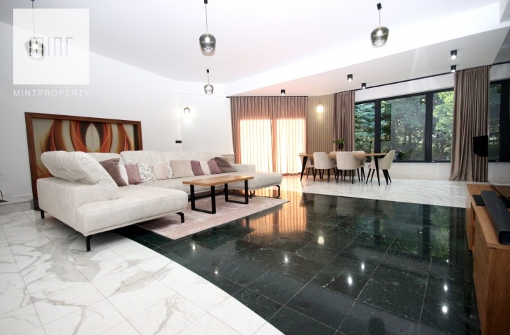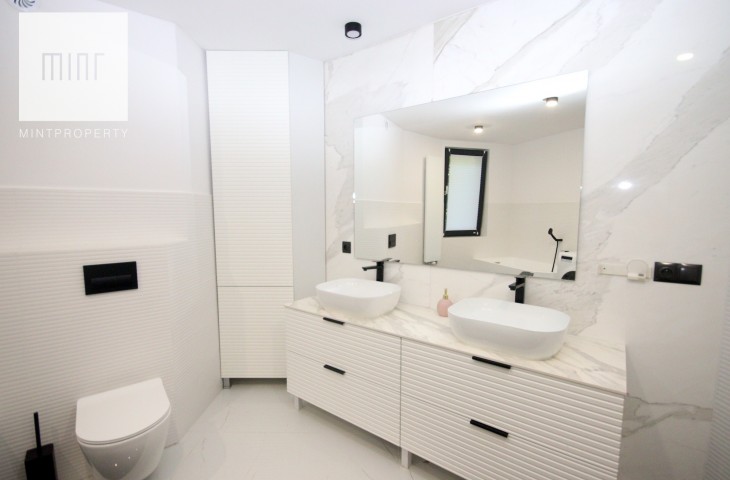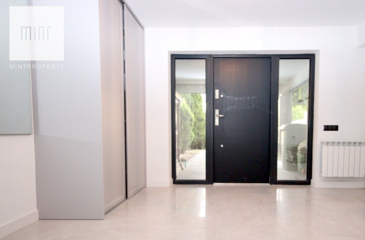 Na podłodze w pokojach deski podłogowe, w pozostłych pomieszczeniach marmur, ściany z eleganckimi tapetami dekoracyjnymi, balustrady szklane, schody marmurowe, okna trójszybowe, które znakomiecie wyciszają wnętrze wraz z zasłonami termicznymi.