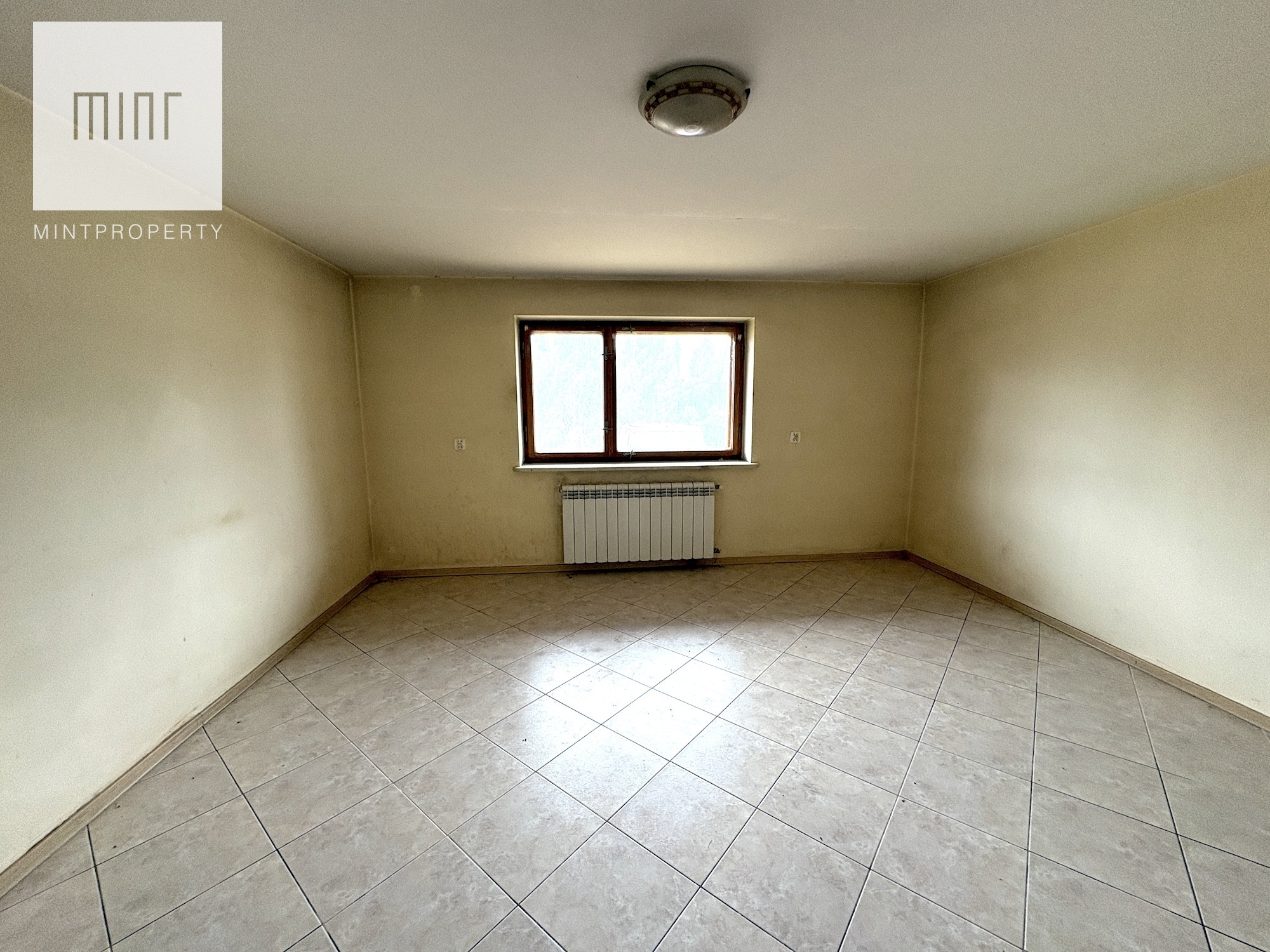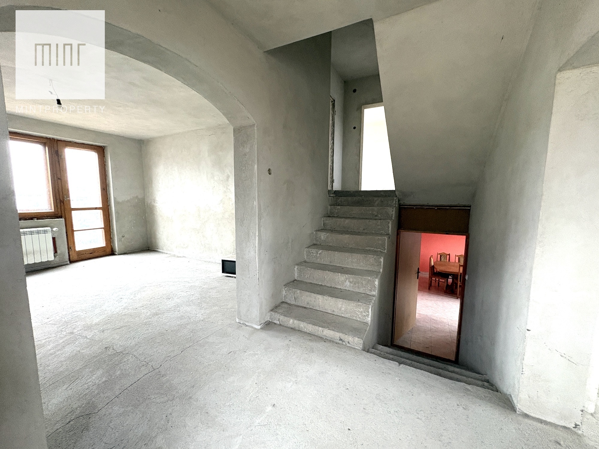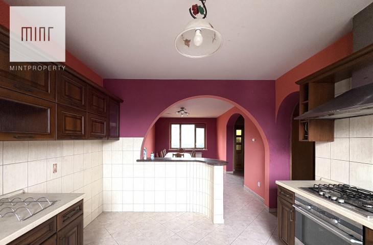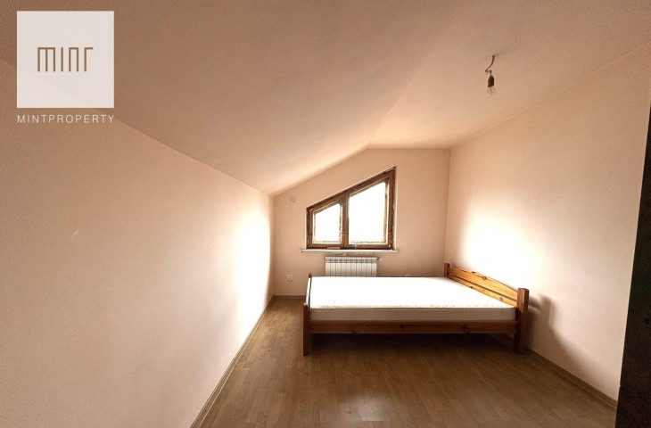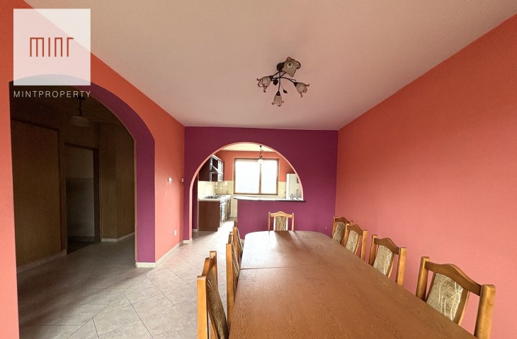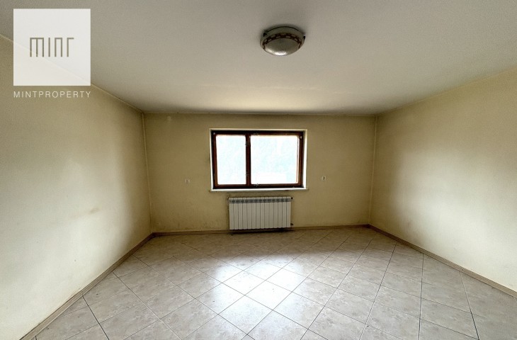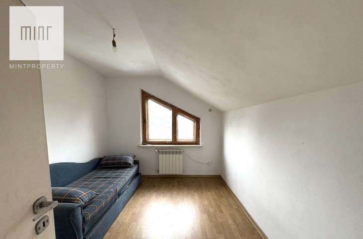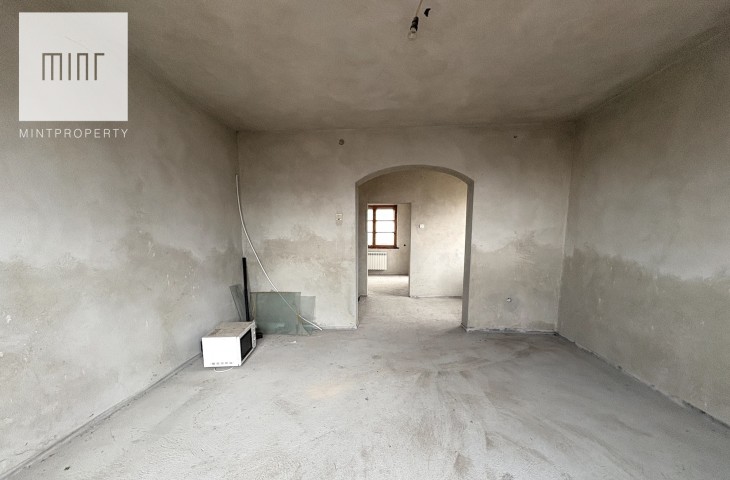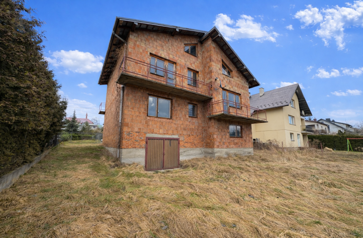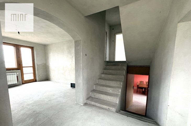 Budynek składający się z: garażu (ok. 28 mkw), kotłowni, pralni, pomieszczeń gospodarczych, salonu z jadalnią, kuchni, 2 łazienek, 7 pokoi (dwa ze skosem) - wszytskie pomieszczenia wymagają remontu lub wykończenia. Układ pomieszczeń sprawia, szerokie możliwości aranżacyjne. Niezależne poziomy oraz rozkład wnętrz pozwalają na przystosowanie nieruchomości pod działalność usługową (np. biura, gabinety, kancelarie) lub wydzielenie kilku lokali mieszkalnych.