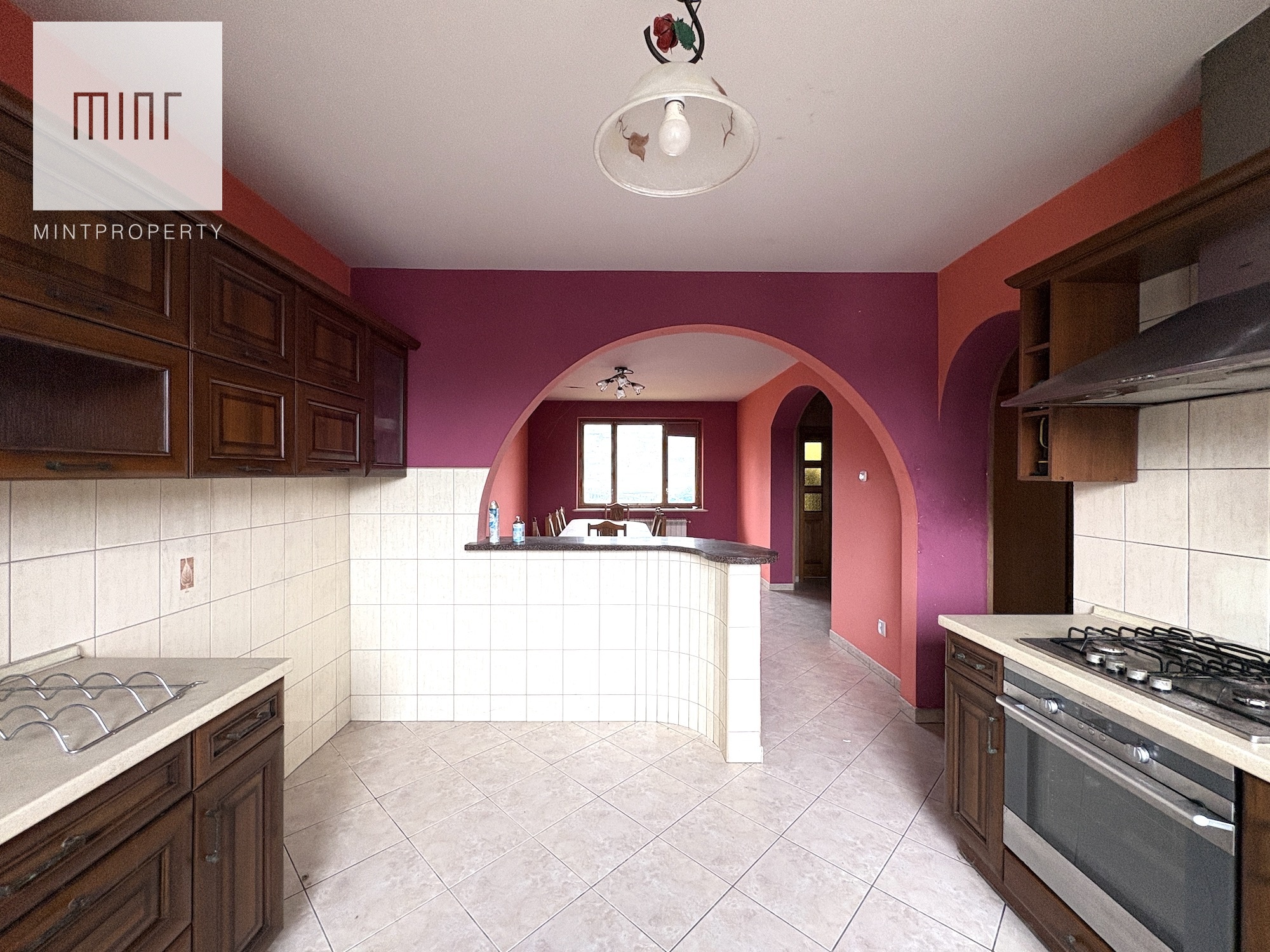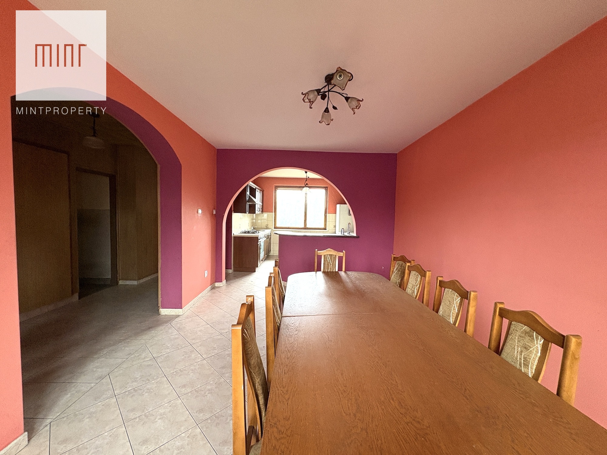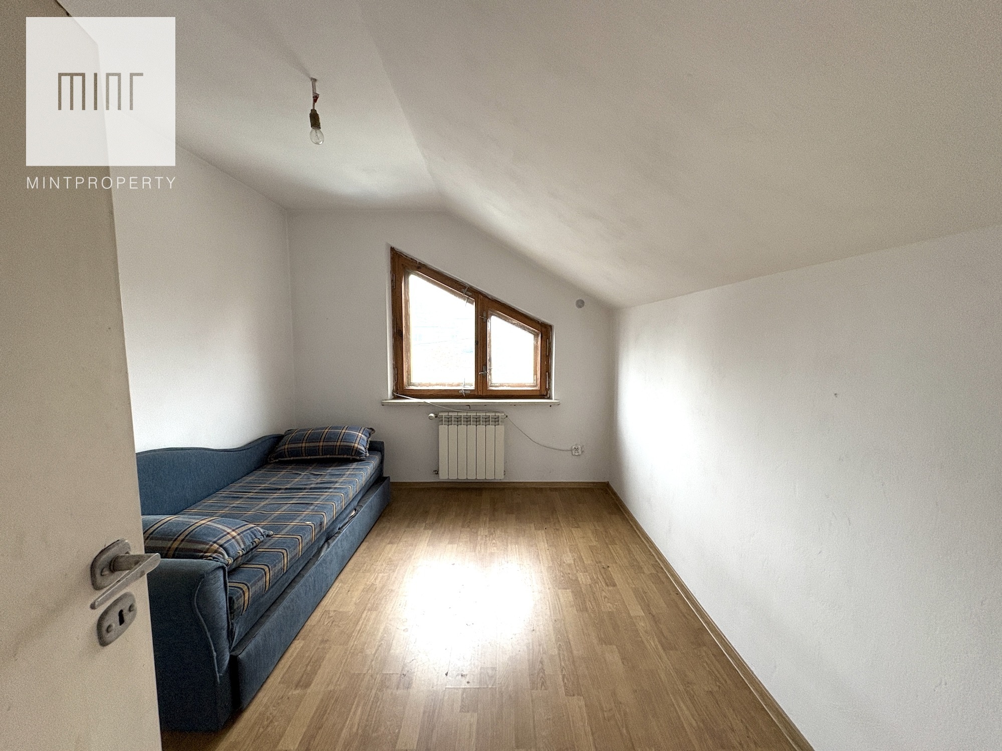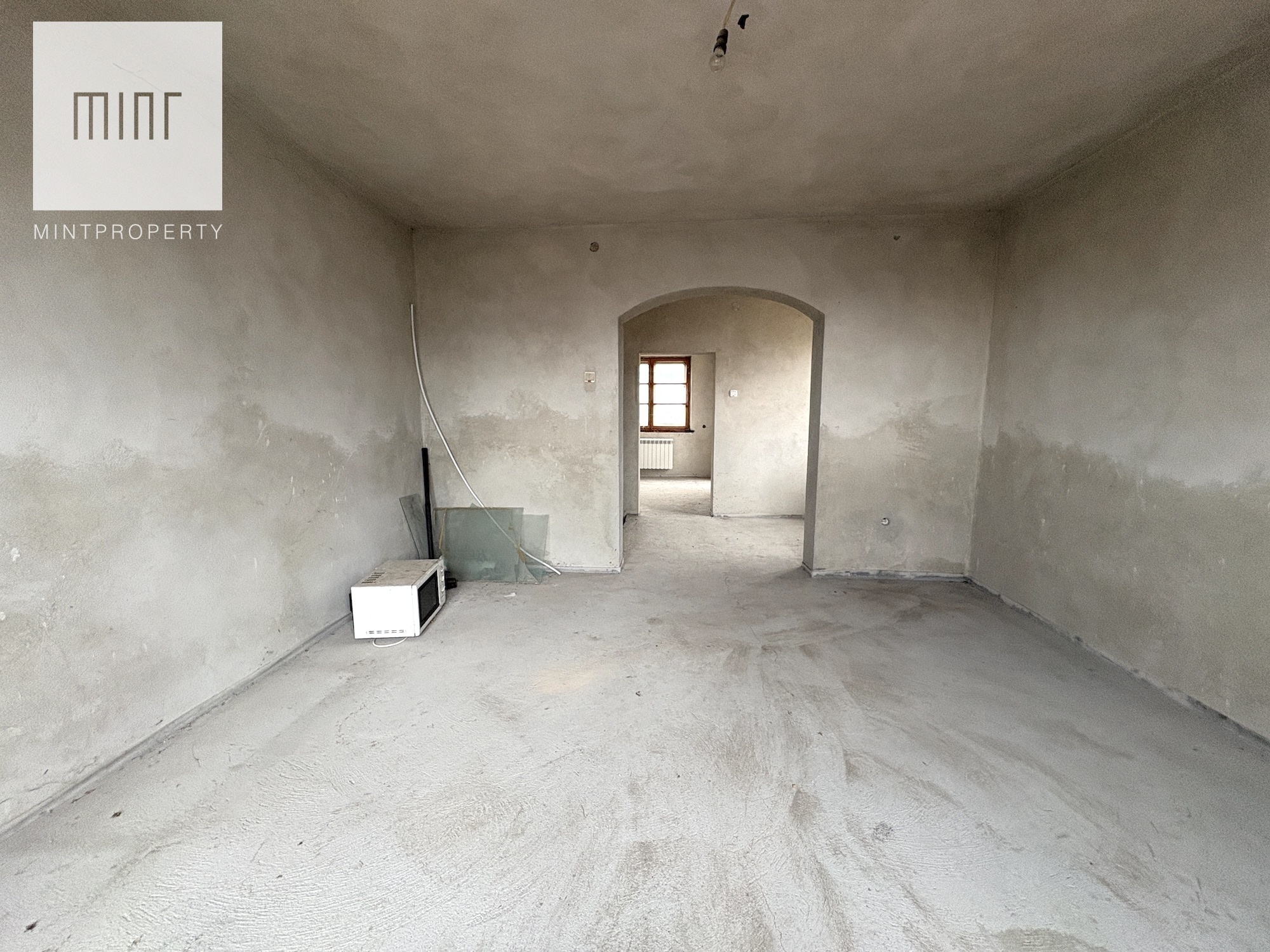 Budynek składający się z: garażu (ok. 28 mkw), kotłowni, pralni, pomieszczeń gospodarczych, salonu z jadalnią, kuchni, 2 łazienek, 7 pokoi (dwa ze skosem) - wszytskie pomieszczenia wymagają remontu lub wykończenia. Układ pomieszczeń sprawia, szerokie możliwości aranżacyjne. Niezależne poziomy oraz rozkład wnętrz pozwalają na przystosowanie nieruchomości pod działalność usługową (np. biura, gabinety, kancelarie) lub wydzielenie kilku lokali mieszkalnych.