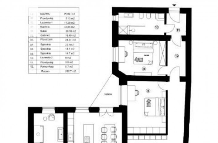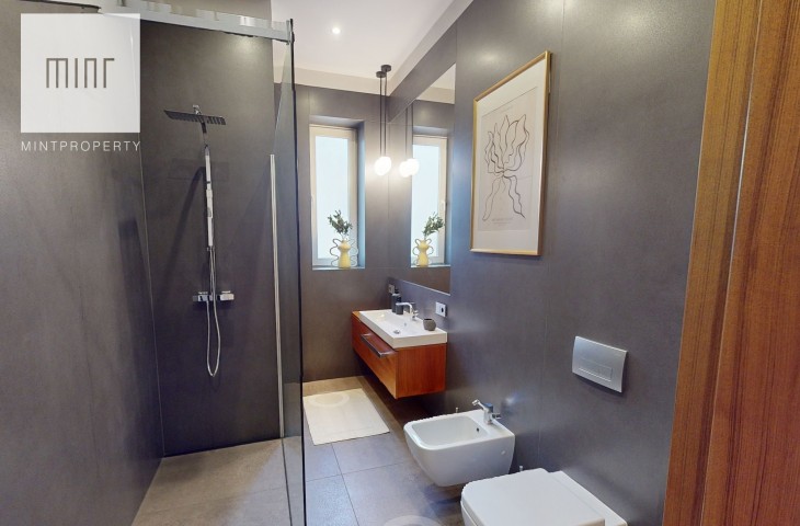 Apartament jest wykończony w bardzo wysokim standardzie, zachowując zabytkowe elementy dekoracyjne. Designerskie wyposażenie stwarza niepowtarzalny klimat mieszkania.