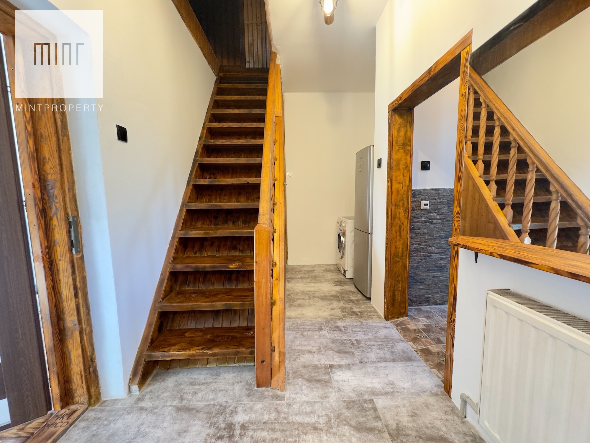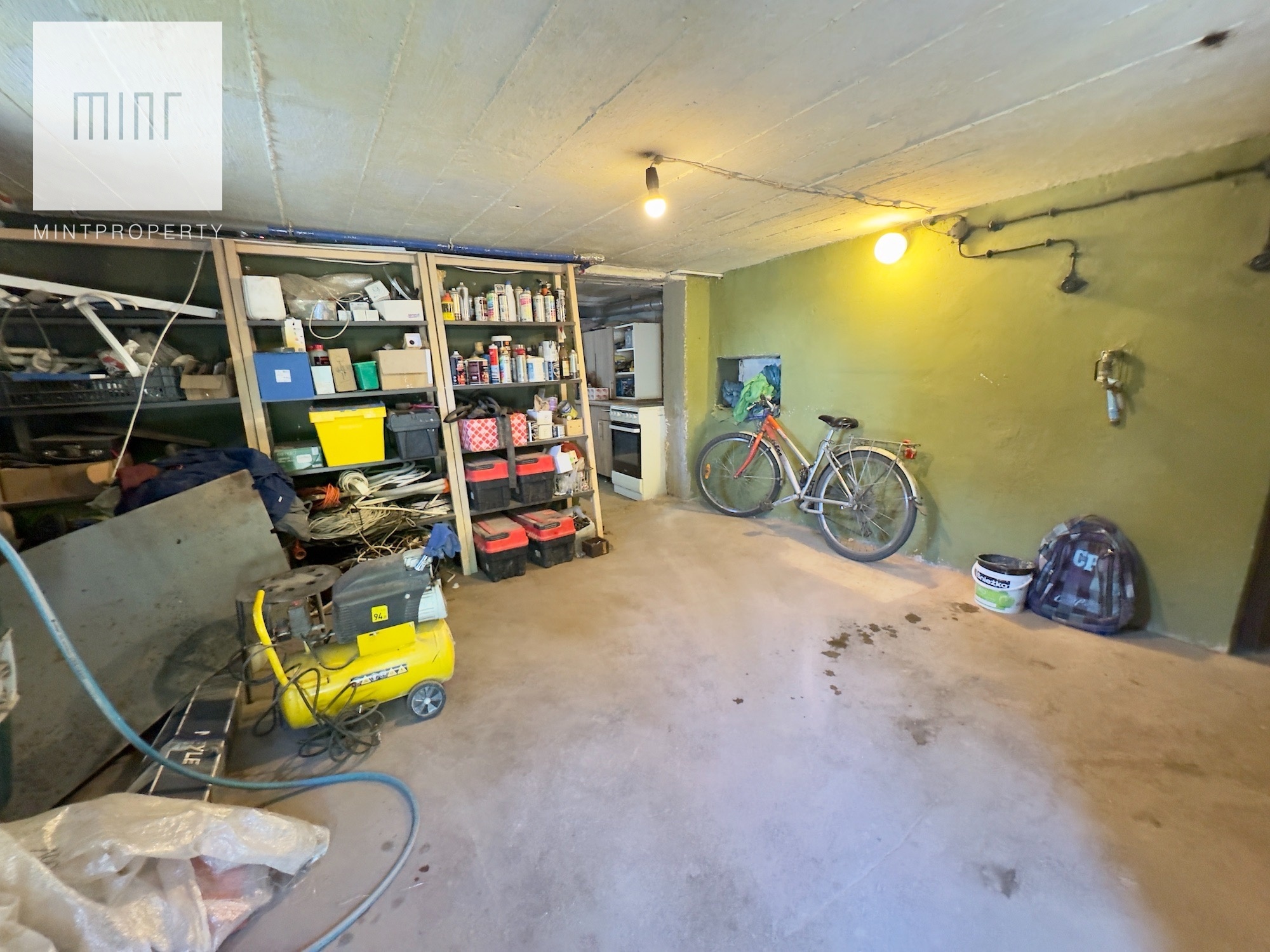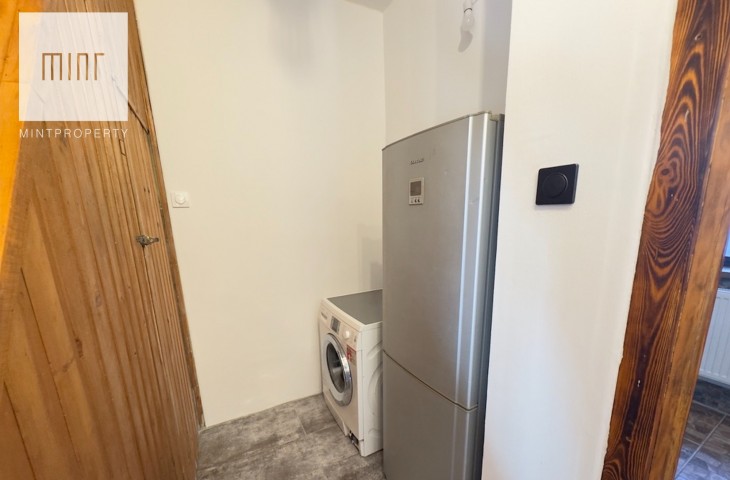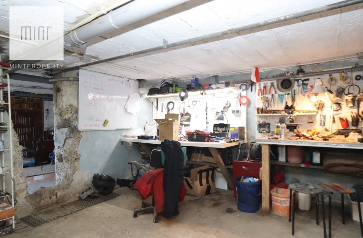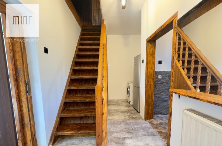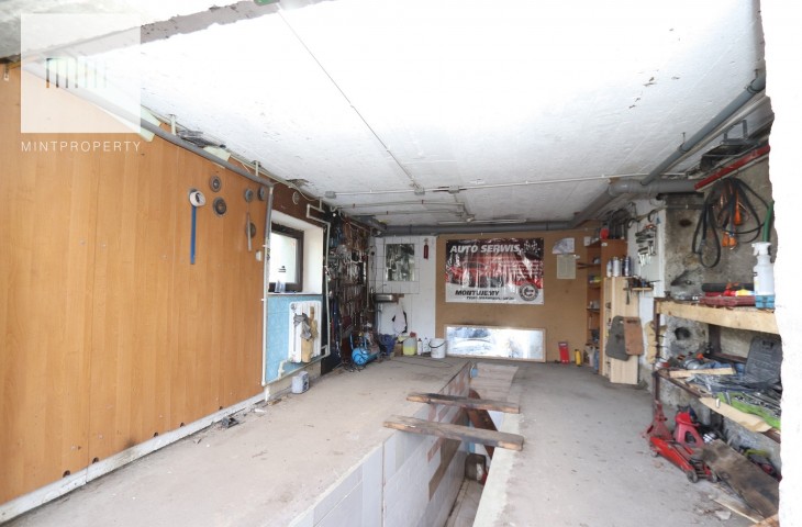 Budynek podpiwniczony z garażem wyposażonym w kanał, aktualnie podzielony na dwa niezależne mieszkania, instnieje możliwośc przywrócenia do stanu pierwotnego. Do budynku bezpośrednio przylega wiata z parkingiem na dwa samochody. Budynek wybudowany z cegły, ocieplony styropianem, kryty dachówką.