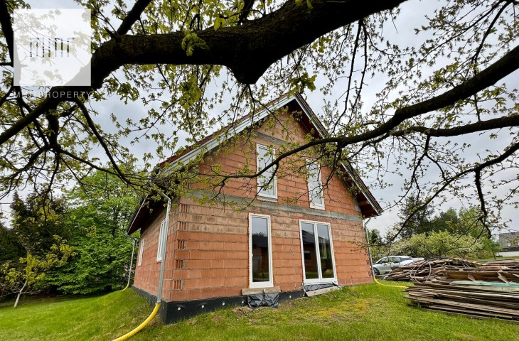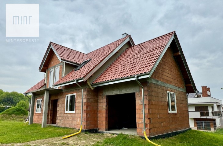Budynek z garażem w bryle, w stanie surowym zamkniętym, przykryty dachówką ceramiczną, zamontowane okna dachowe Velux oraz okna PCV Oknoplast.