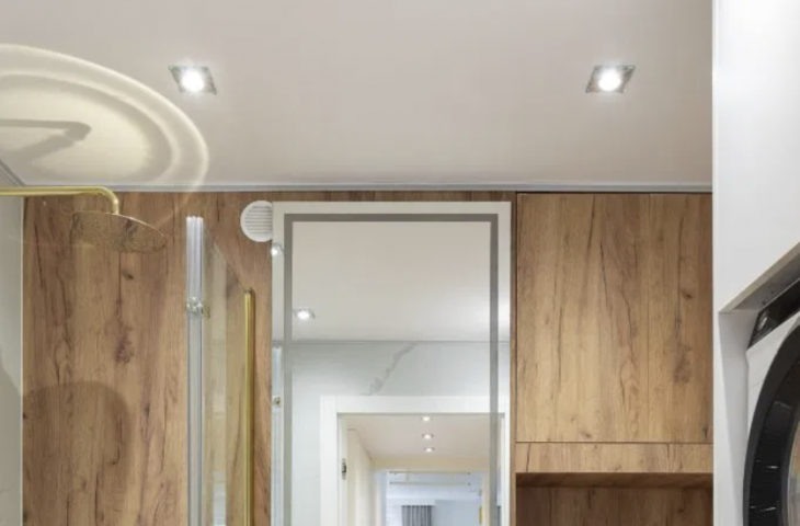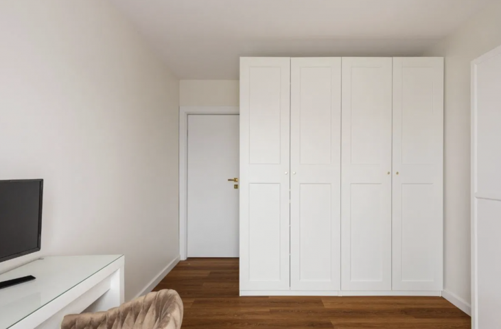Meble w sypialni zostały zrobione na wymiar. Łazienka posiada wannę z funkcją prysznica oraz zabudowaną pralkę i suszarkę. W całym mieszkaniu jest oświetlenie LED.