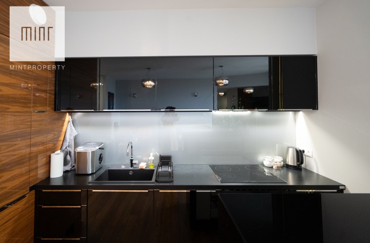 Aneks kuchnny w jest pełni wyposażona w wysokiej klasy sprzęt AGD (płyta indukcyjna, zmywarka, lodówko-zamrażarka, piekarnik, okap)
