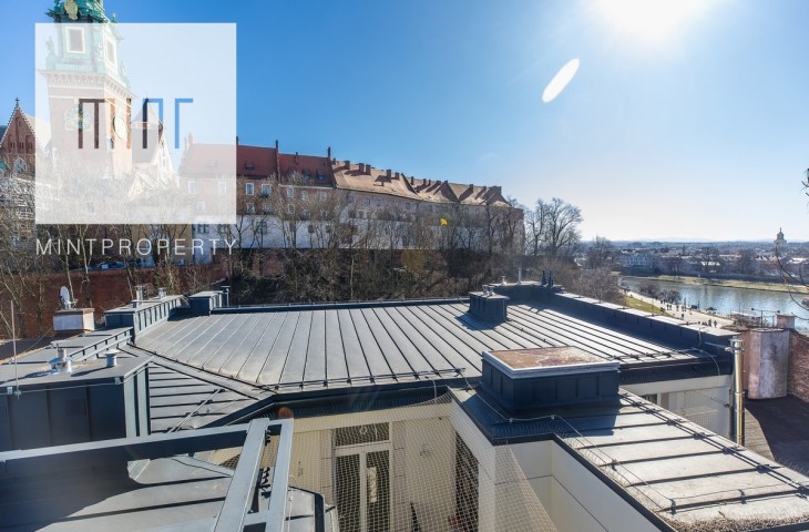 Indywidualny taras na dachu z panoramą 360 stopni o powierzchni 40 m2, z którego roztacza się spektakularny widok na Krakowskie Stare Miasto, Wisłę oraz Wawel, który z tego miejsca jest dosłownie na wyciągnięcie ręki.