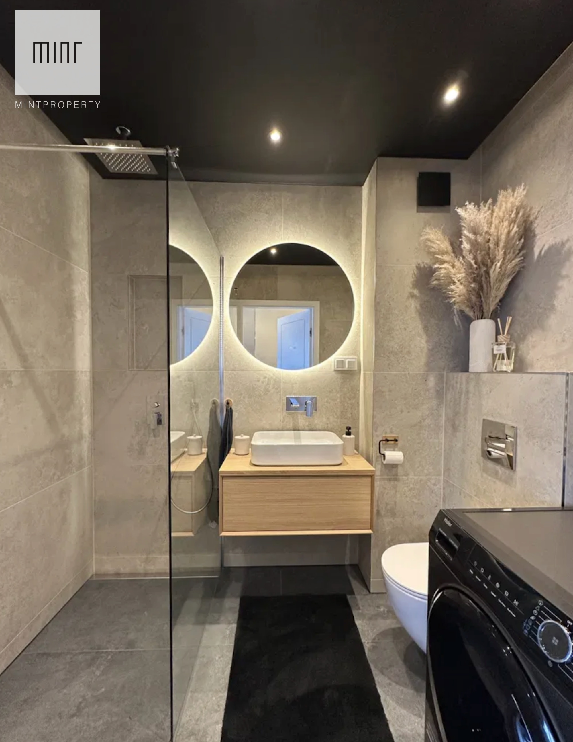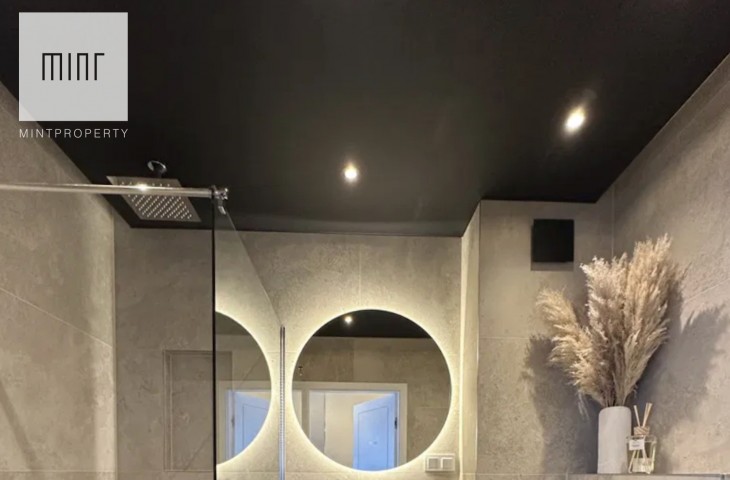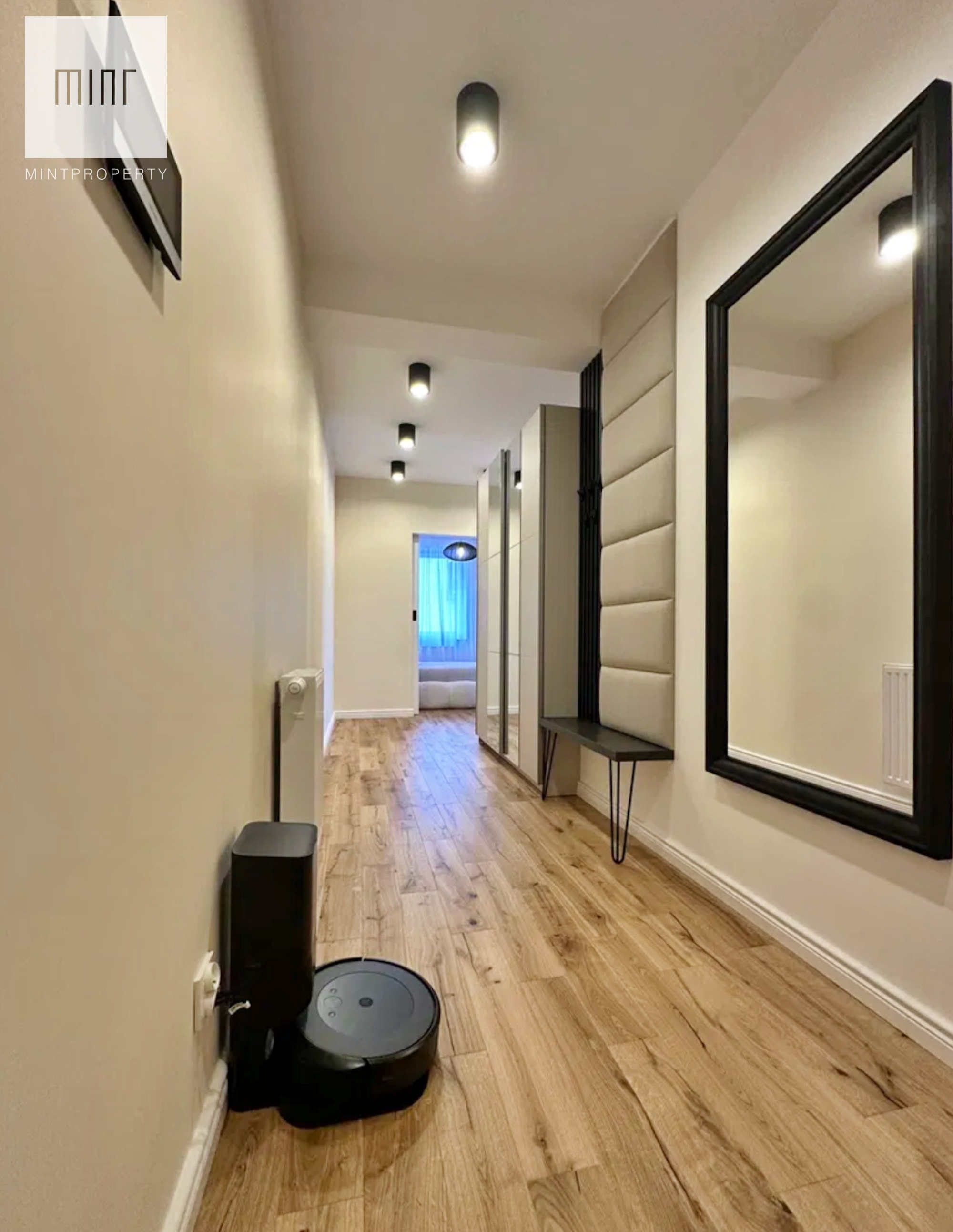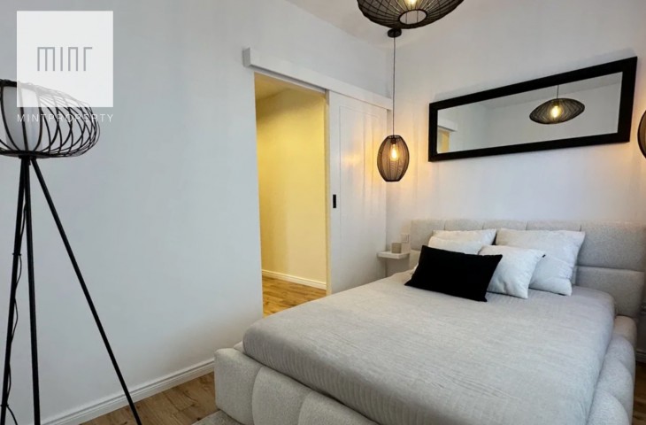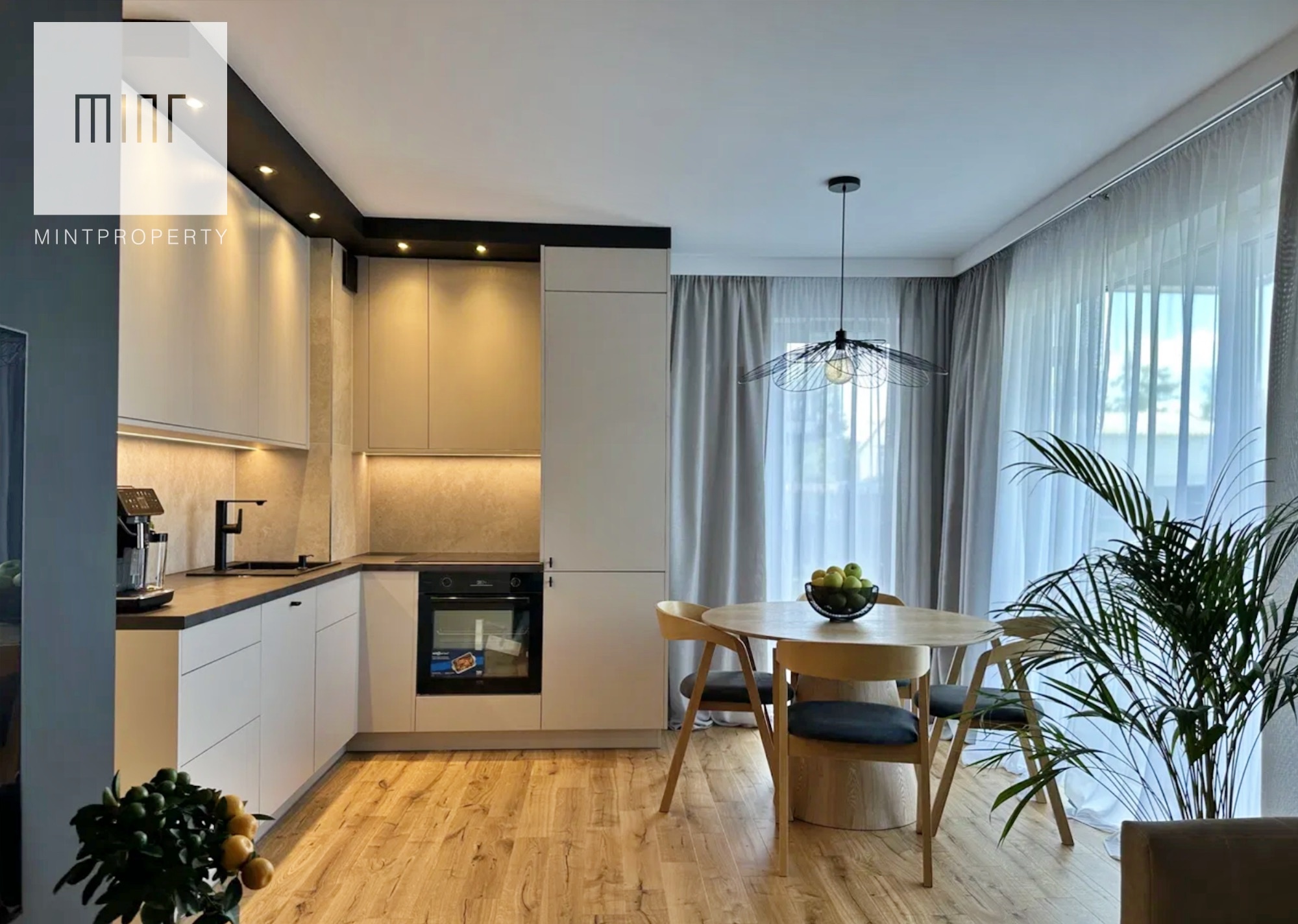 Kuchnia wykonana na wymiar, z nowymi urządzeniami AGD firmy Beko - płyta ceramiczna, okap, zmywarka i lodówka w zabudowie. Obok znajduje się duży stół fornirowany naturalnym dębem z kompletem krzeseł. W salonie wygodna kanapa z funkcją spania, stolik kawowy, półka RTV oraz telewizor. Łazienka wyposażona w prysznic typu walk-in, armaturę podtynkową, nową pralko-suszarkę Haier, oświetlenie punktowe oraz lustro z matą grzewczą. W sypialni znajduje się łóżko tapicerowane 140x200, stoliki nocne z lampkami oraz miejsce na dużą szafę lub biurko.