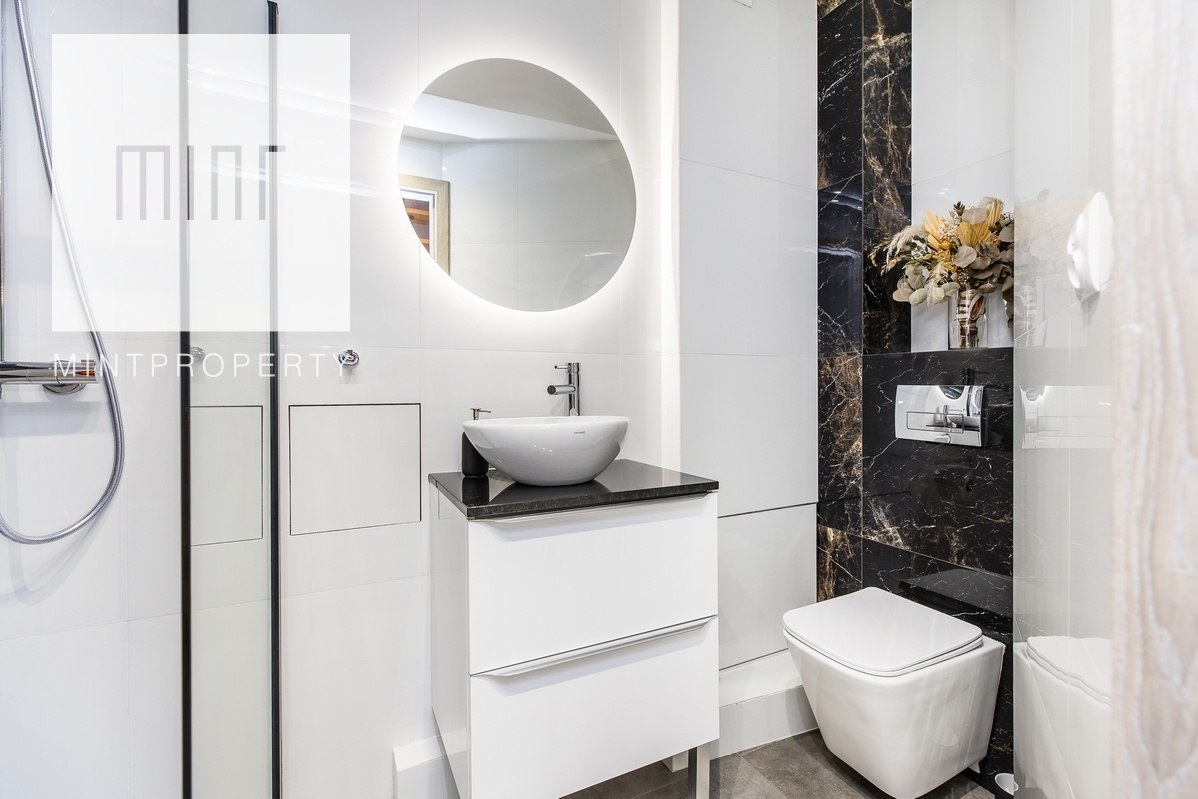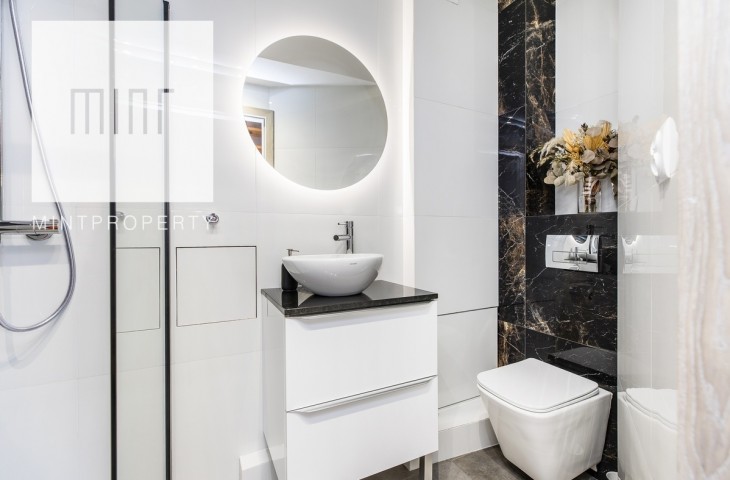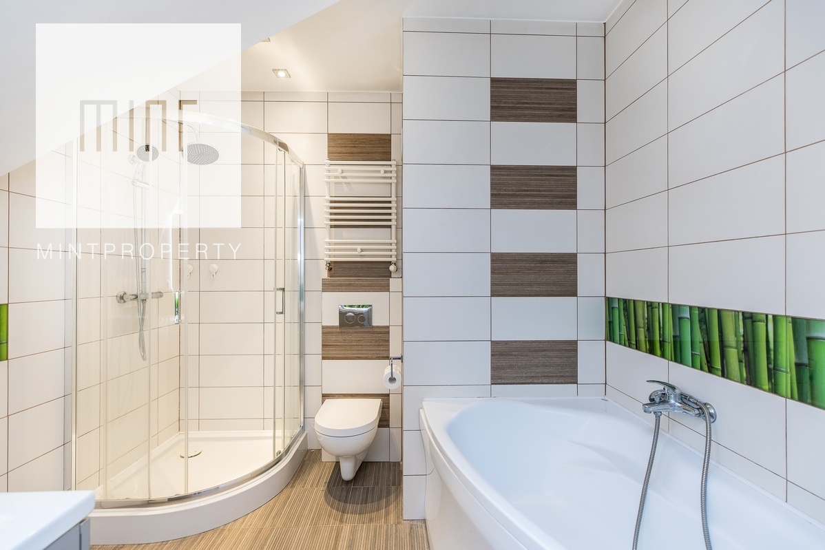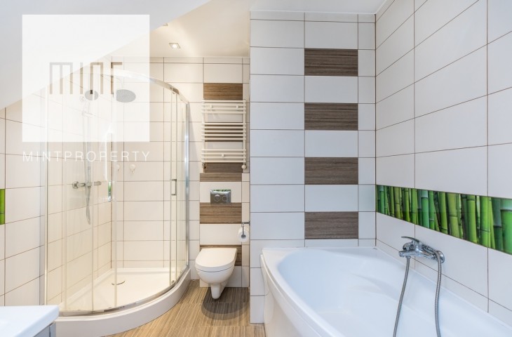 Mieszkanie na dwóch poziomach posiada klimatyzację. Łazienka na dolnym poziomie przeszła remont dwa lata temu, a kuchnia cztery lata temu.