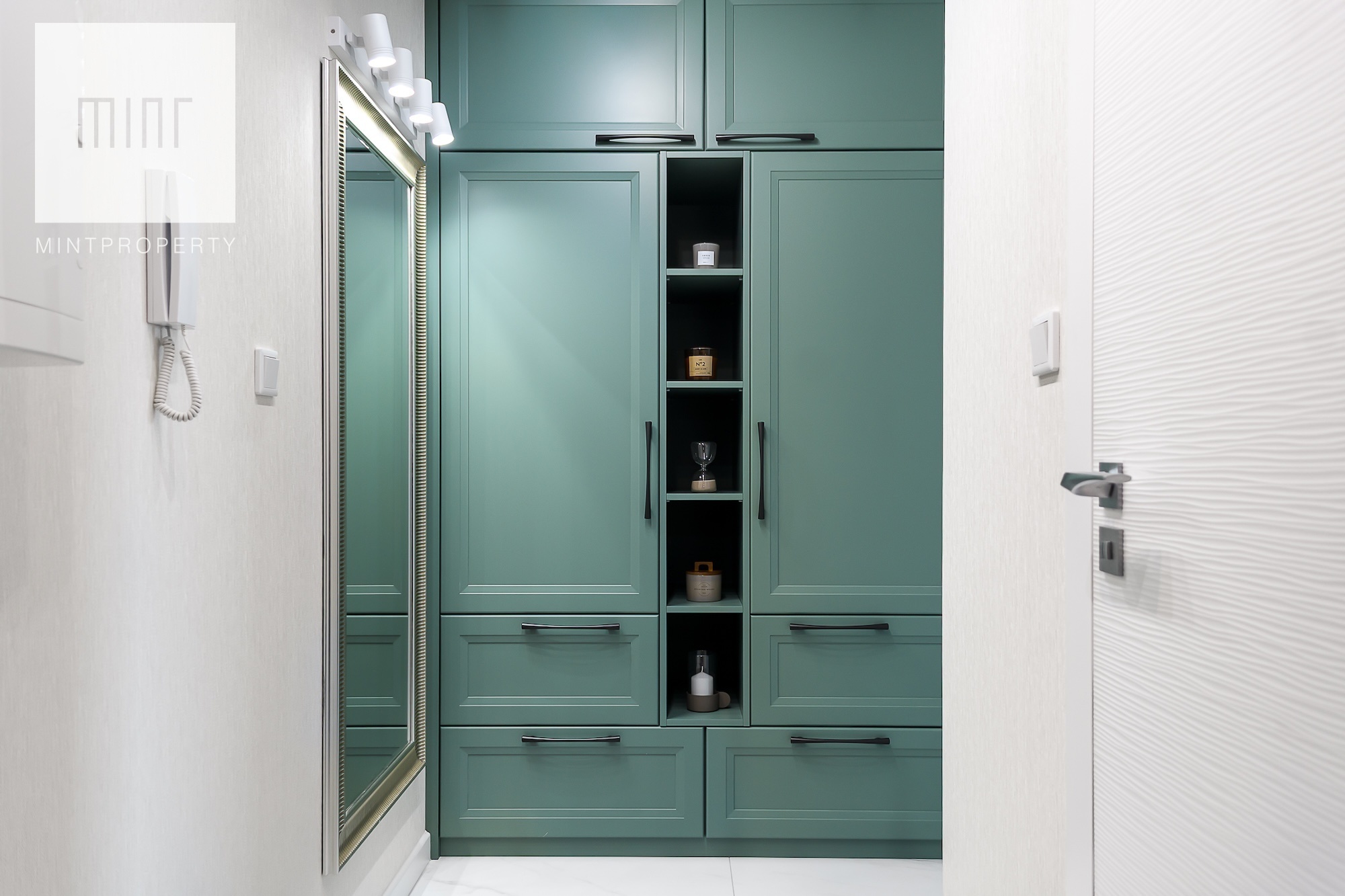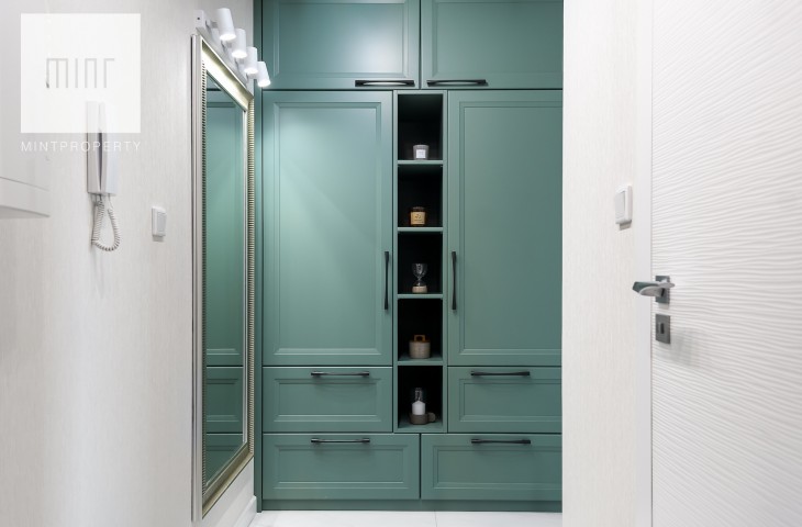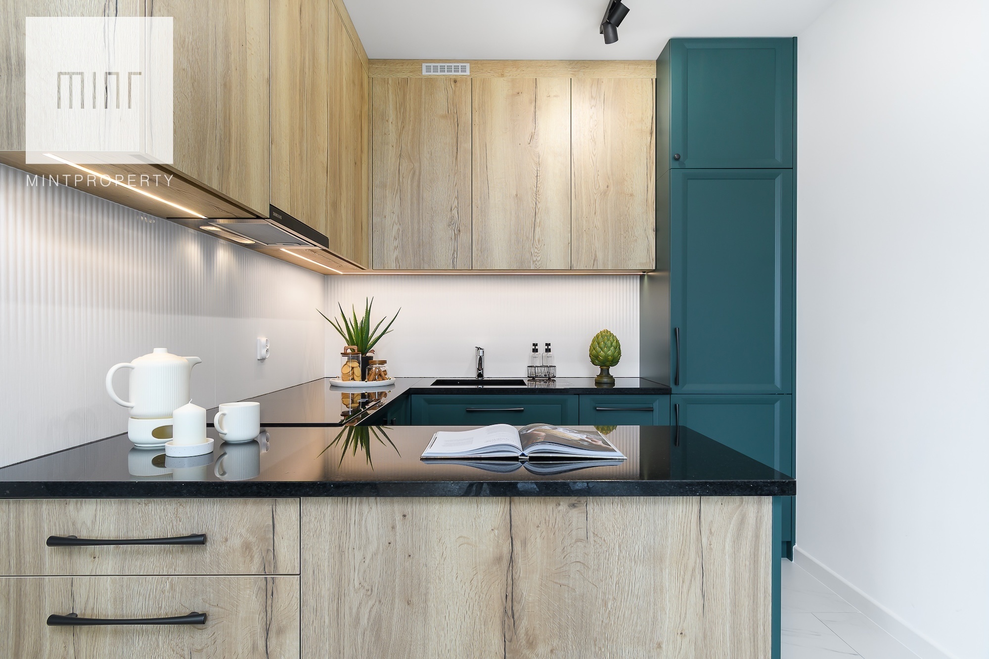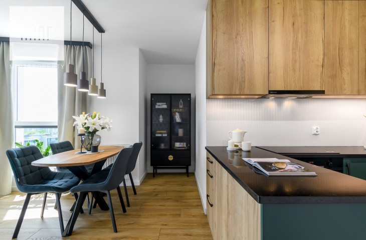 Wnętrze zostało wykończone z dbałością o każdy detal, umeblowane i gotowe do zamieszkania. Zabudowa meblowa wykonana jest z wysokiej jakości materiałów renomowanych marek, co zapewnia zarówno funkcjonalność, jak i elegancki wygląd.