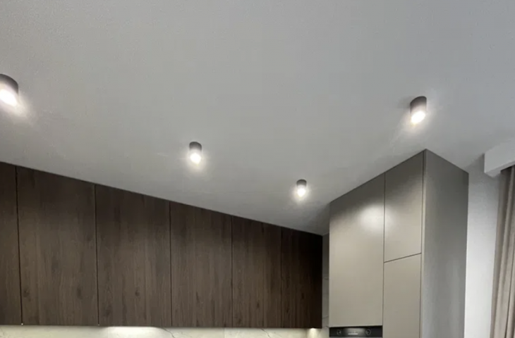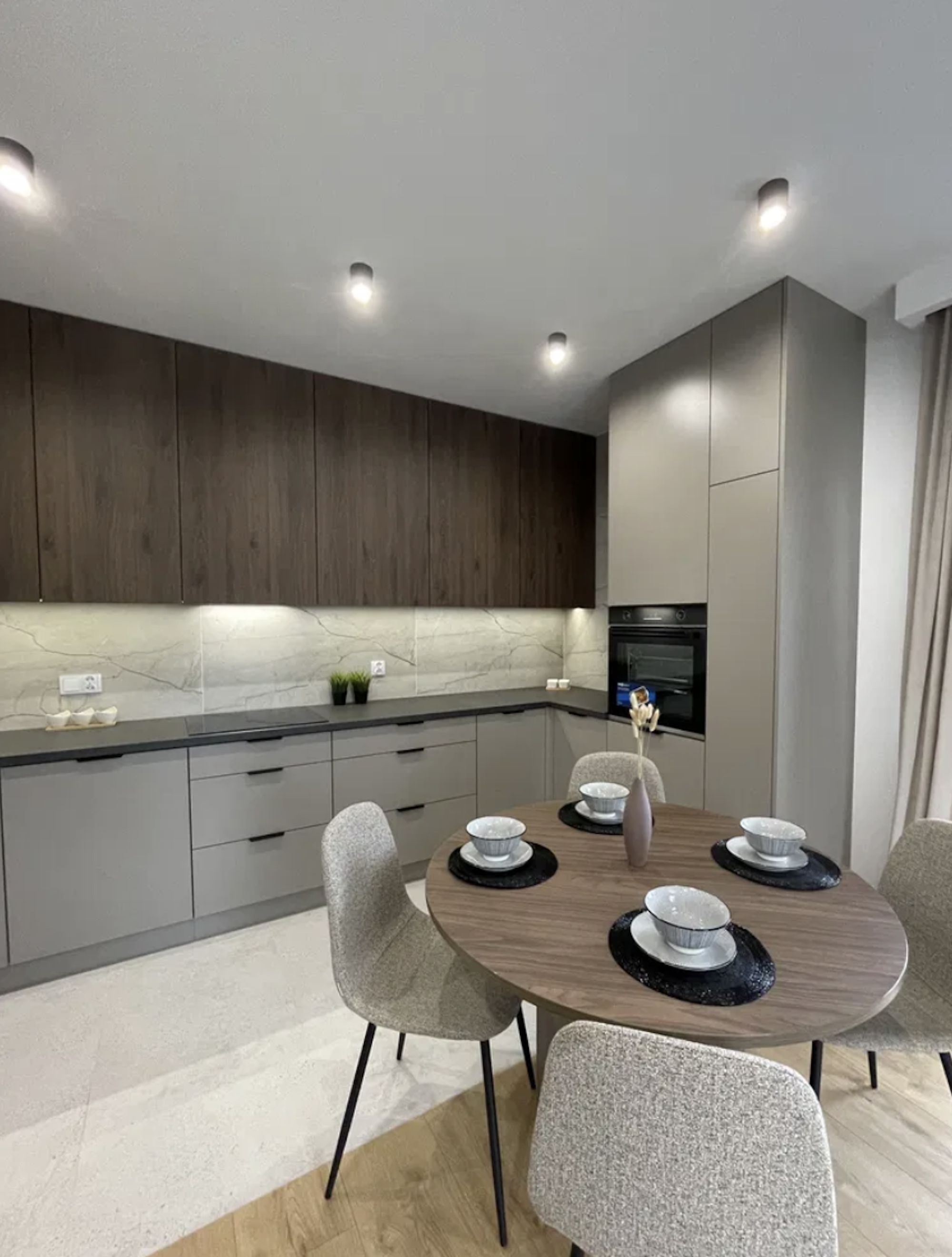 Kuchnia została wyposażona w meble wykonane na wymiar oraz nowy sprzęt AGD. W części wypoczynkowej znajduje się wygodna kanapa i stolik. Podłogi wyłożono eleganckimi panelami oraz płytkami, tworząc spójną i przytulną przestrzeń.
