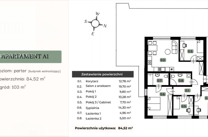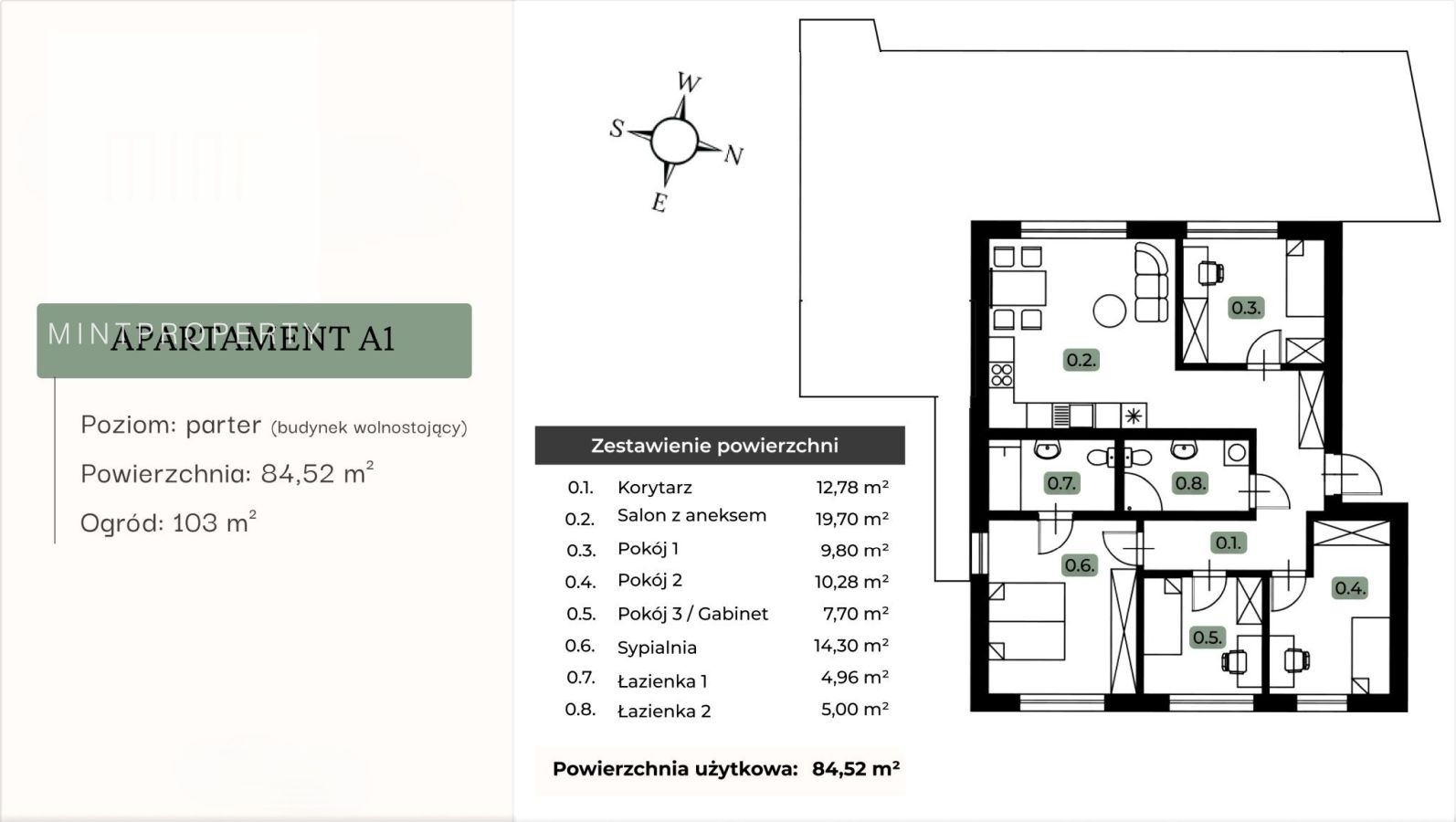 Dodatkowo, do nieruchomości przynależy ogród o powierzchni 103 m2 z wyjściem z salonu, pokoju oraz sypialni.