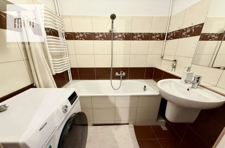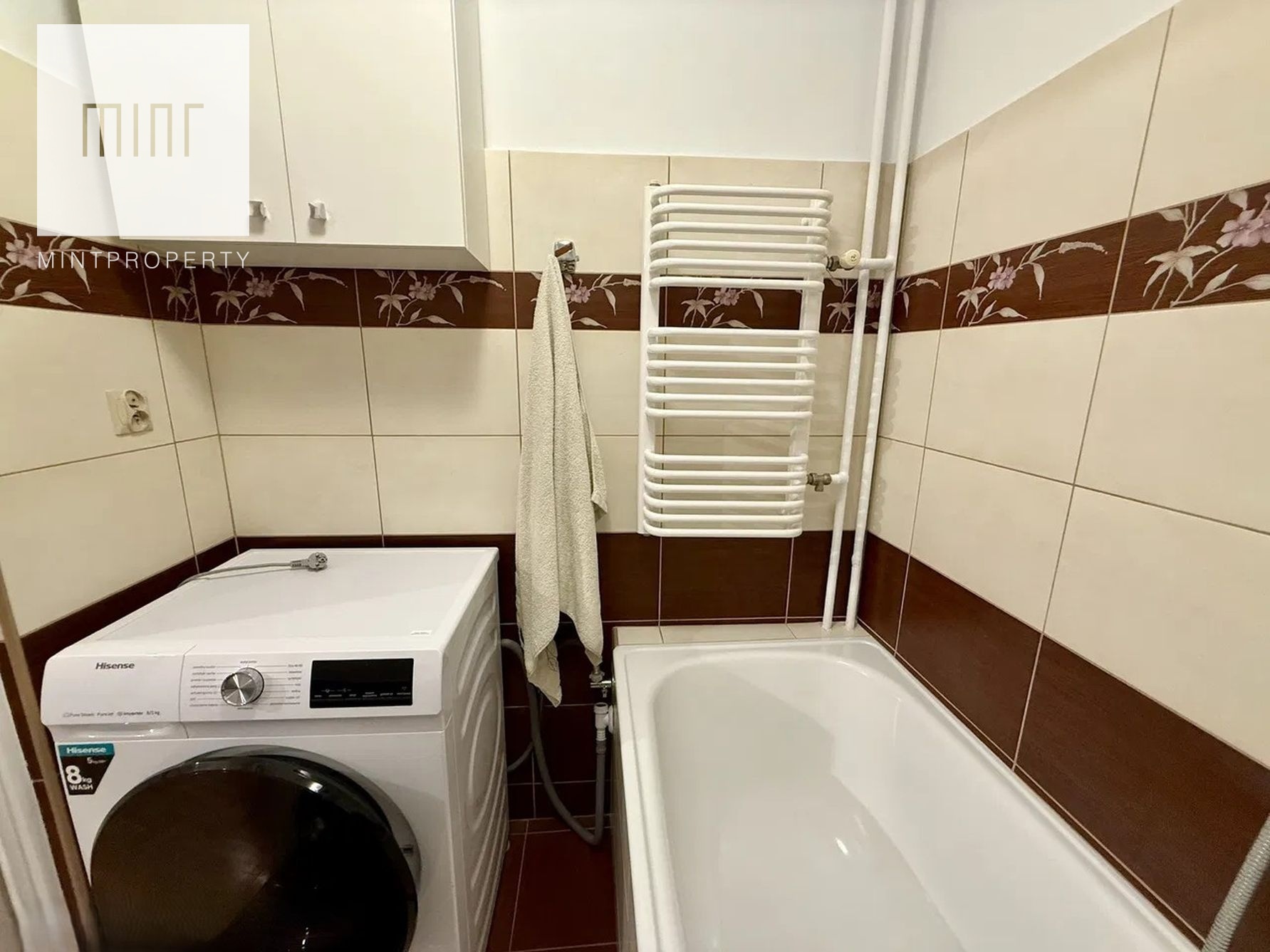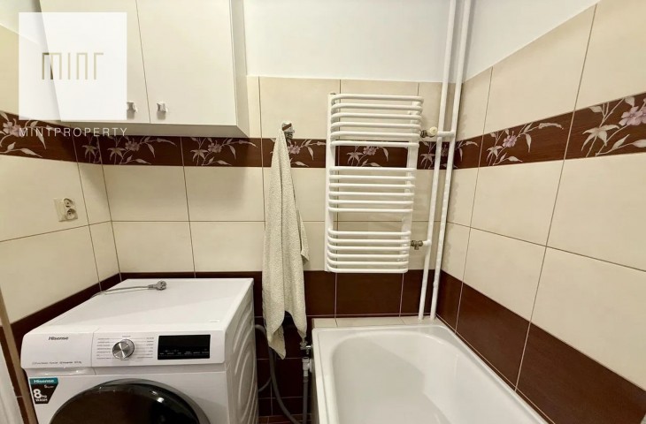 W mieszkaniu znajduje się pełne umeblowanie na wymiar, jest ono również wyposażone w niezbędny sprzęt AGD (lodówka, pralko-suszarka, kuchenka gazowa z funkcją piekarnika oraz mikrofalówka).
