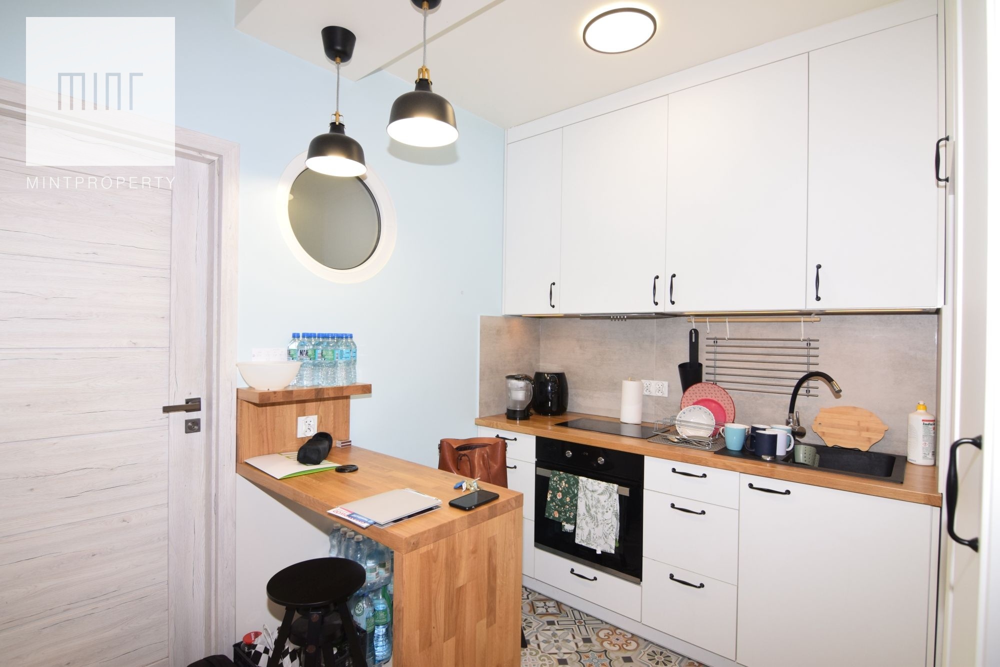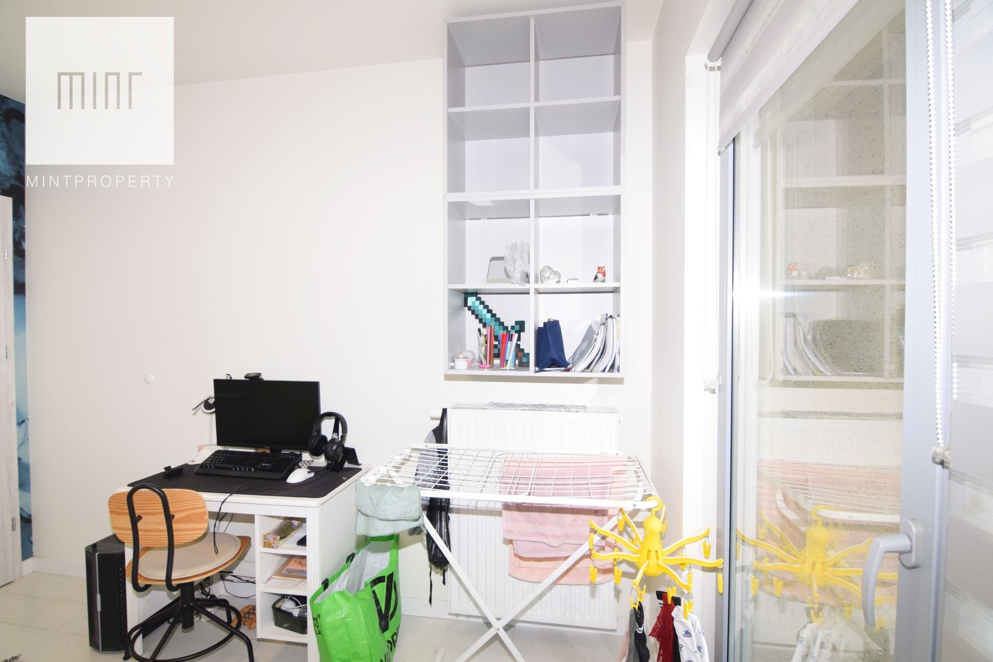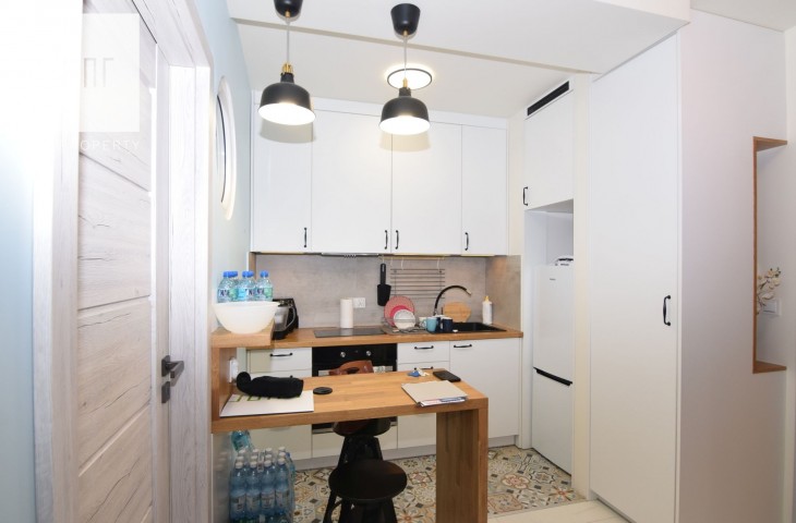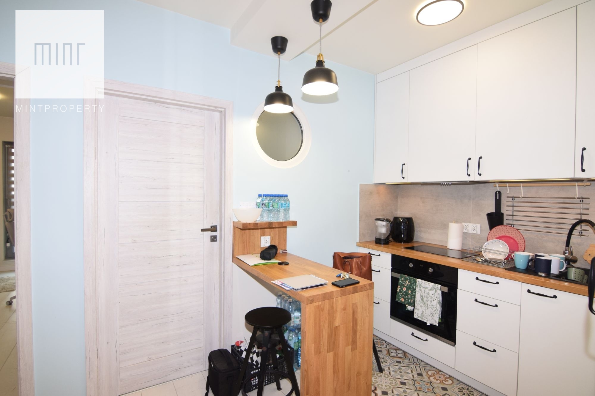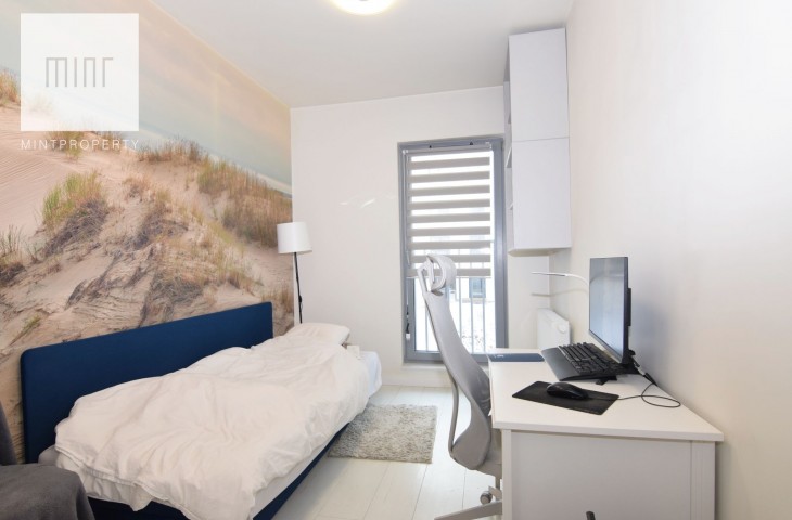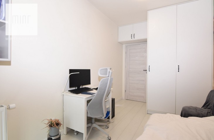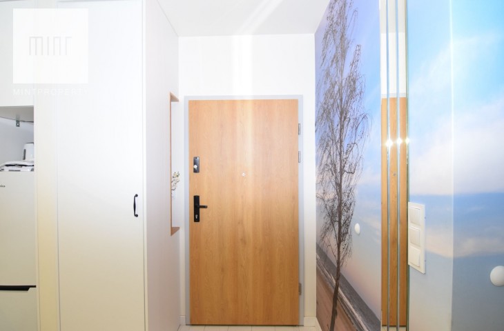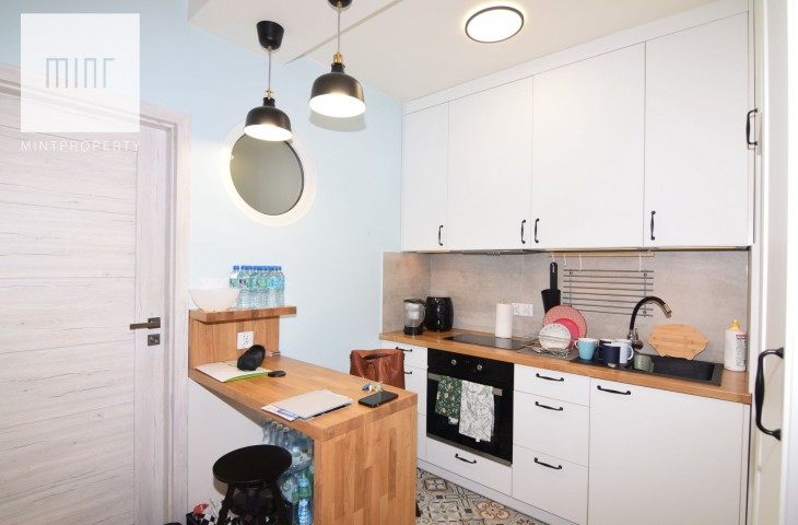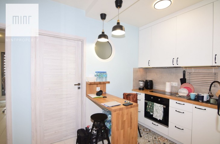 Mieszkanie jest wykończone w wysokim nowoczesnym standardzie, gotowe do wprowadzki. Zarówno kuchnia jak i sprzęt AGD (zmywarka,lodówka,kuchenka,piekarnik) są w zabudowie, a w cenę nieruchomości wliczone jest również umeblowanie.