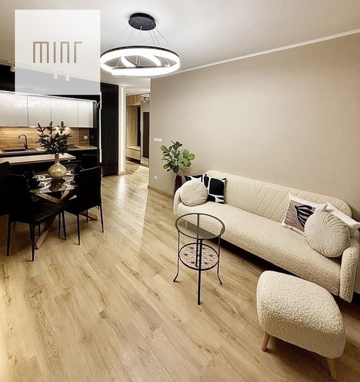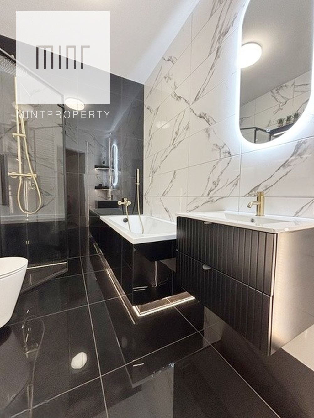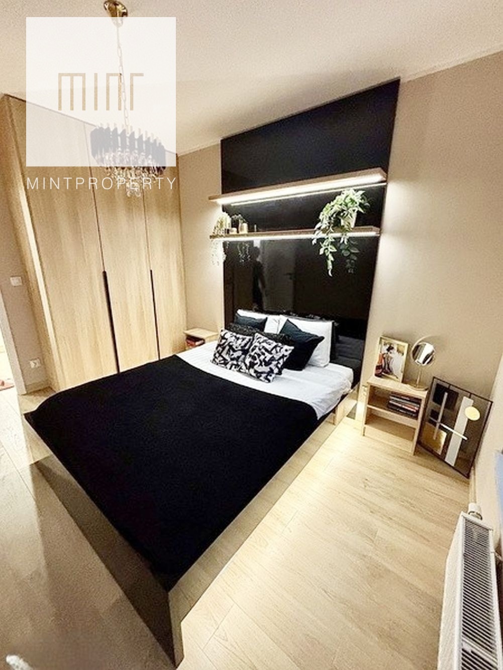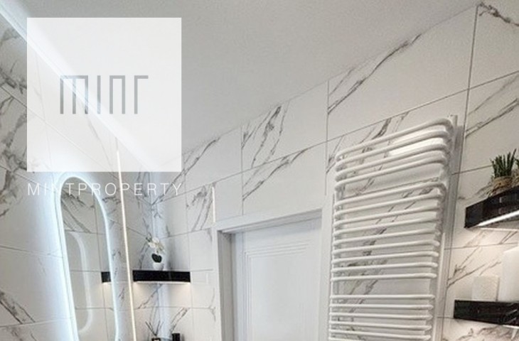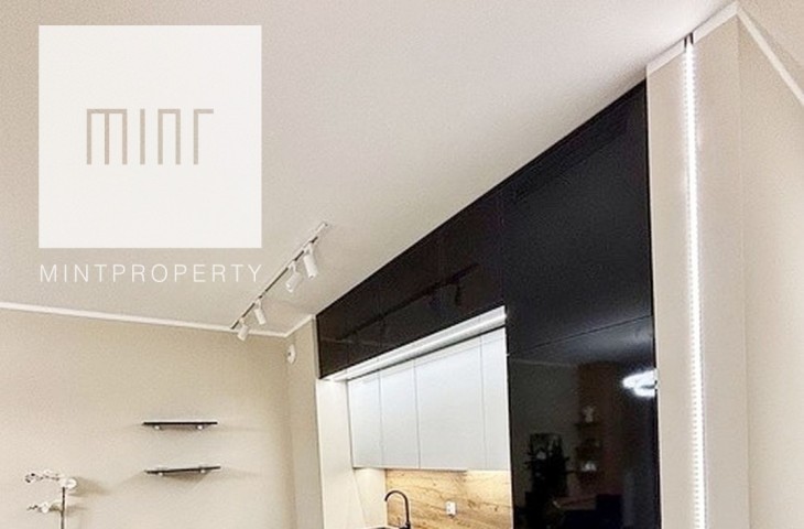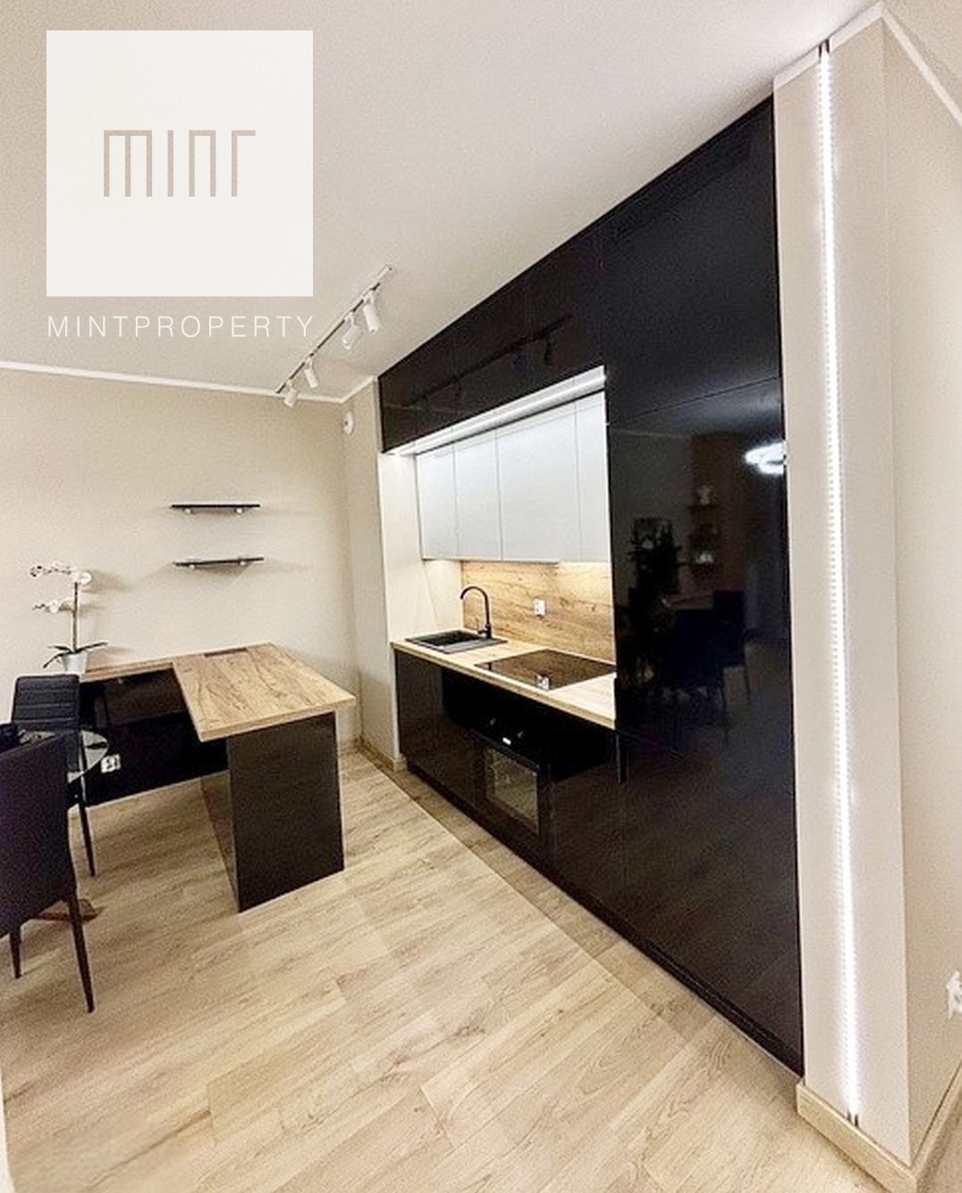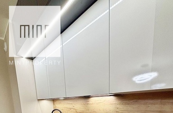 Apartament został wykończony w wysokim standardzie. Zabudowy meblowe oraz oświetlenie zostały zaprojektowane na wymiar. Strefa dzienna łączy część wypoczynkową z elegancką kuchnią w zabudowie oraz funkcjonalnym blatem / wyspą barową.
