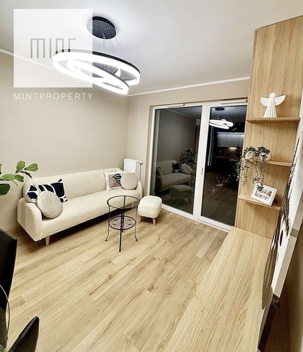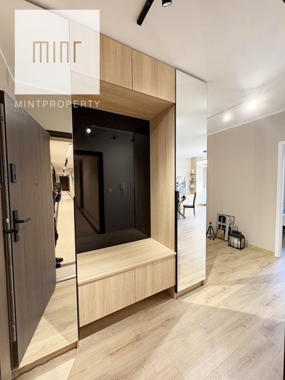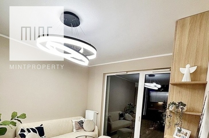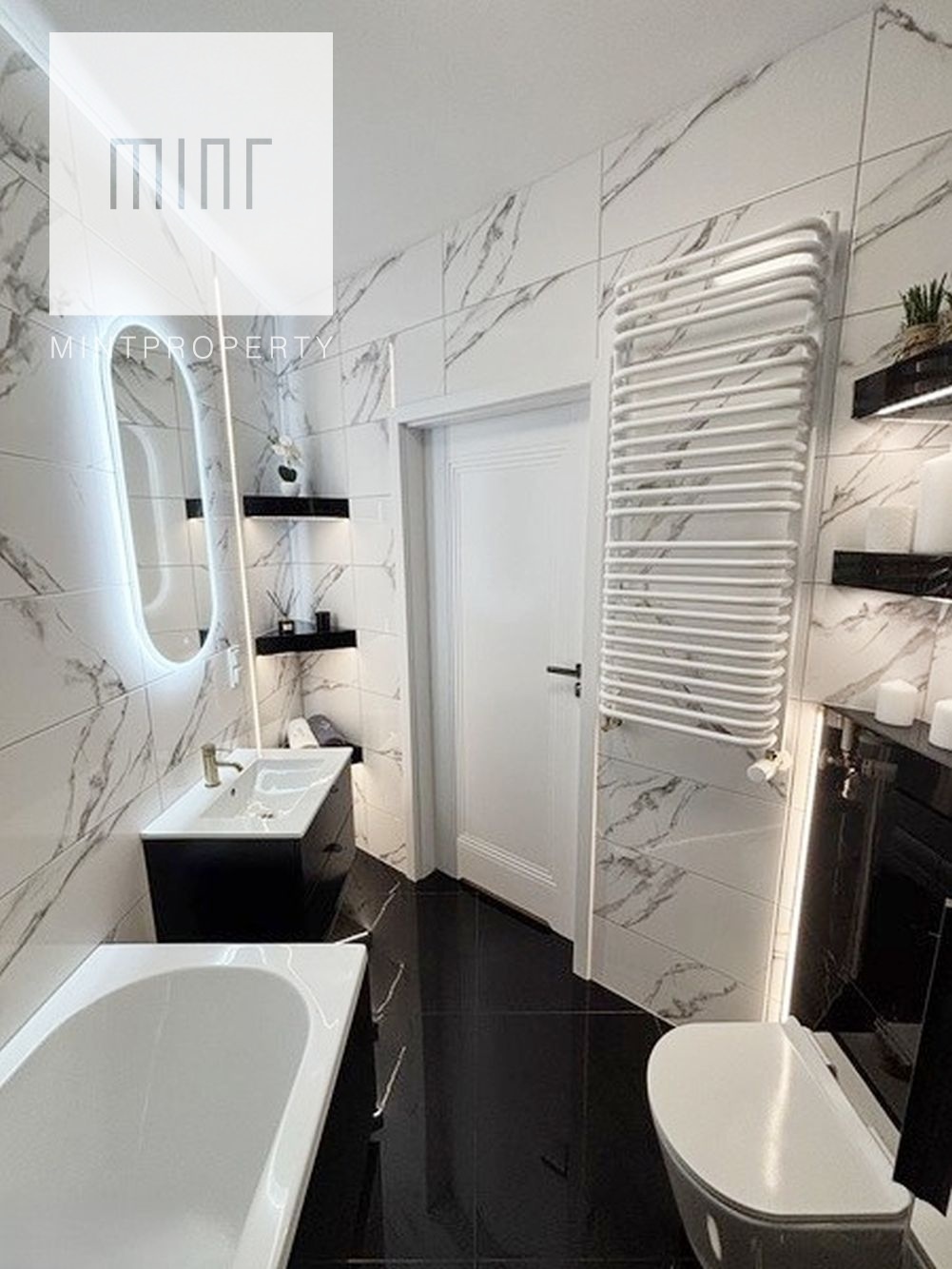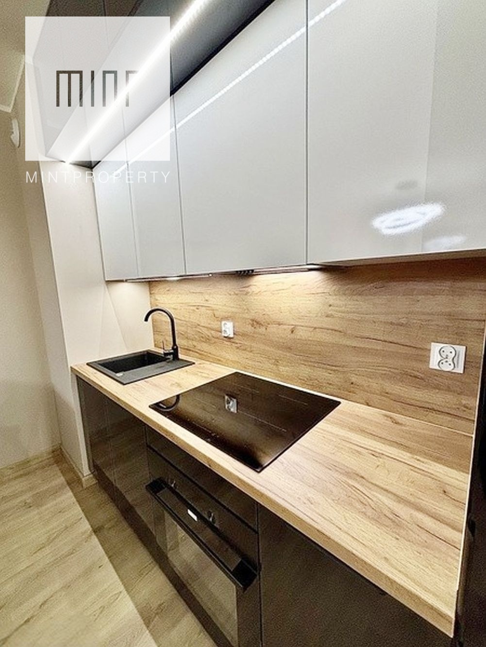 Apartament został wykończony w wysokim standardzie. Zabudowy meblowe oraz oświetlenie zostały zaprojektowane na wymiar. Strefa dzienna łączy część wypoczynkową z elegancką kuchnią w zabudowie oraz funkcjonalnym blatem / wyspą barową.