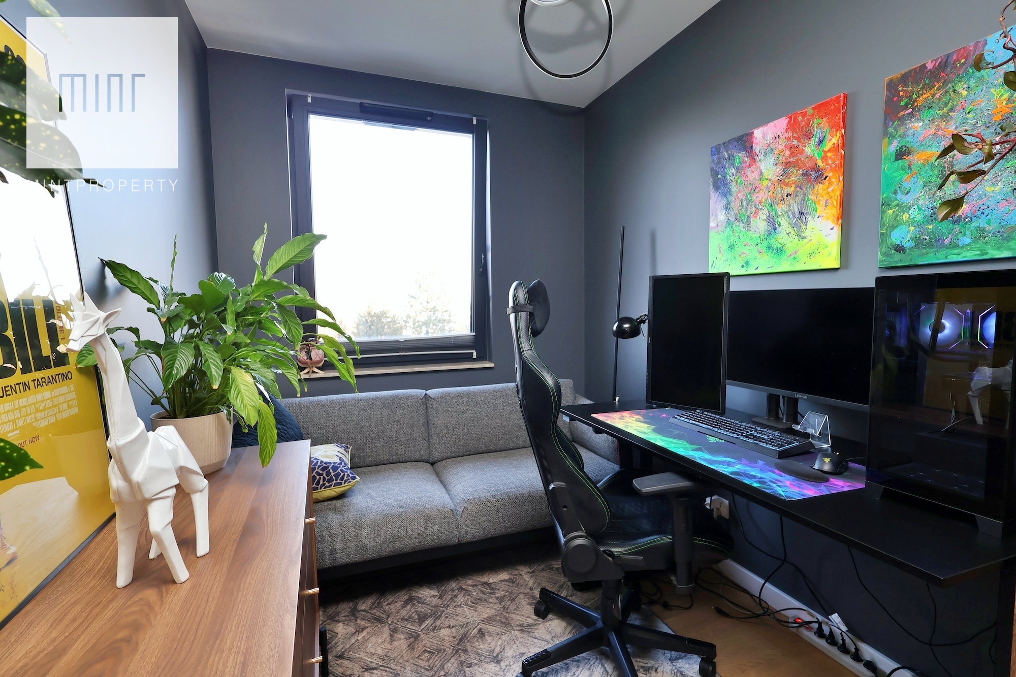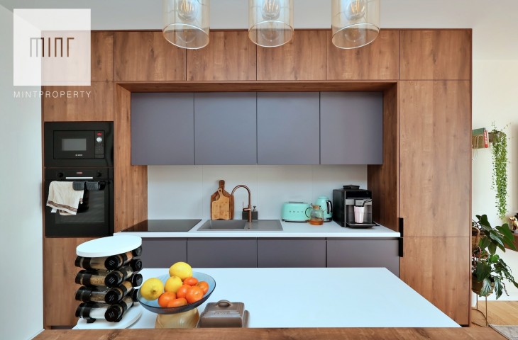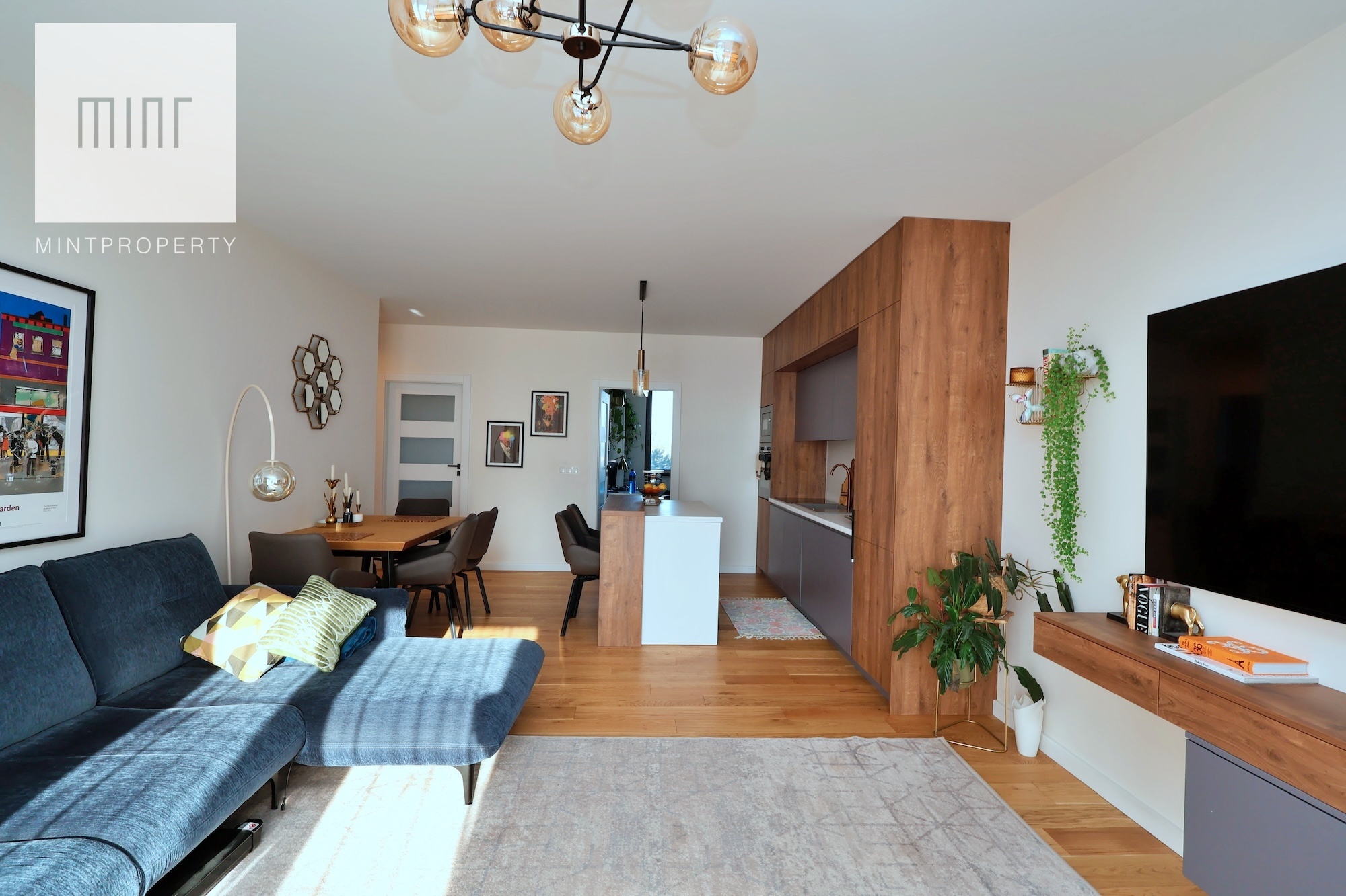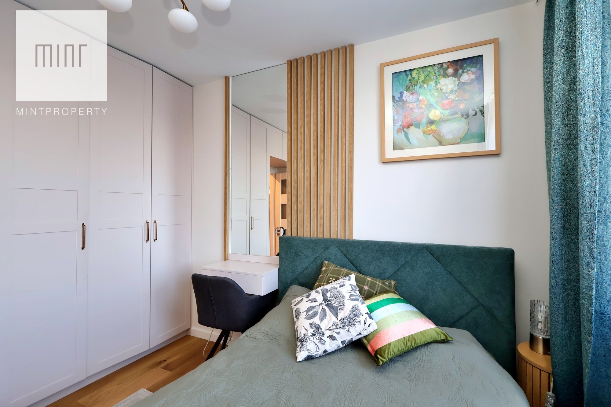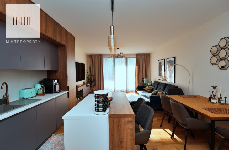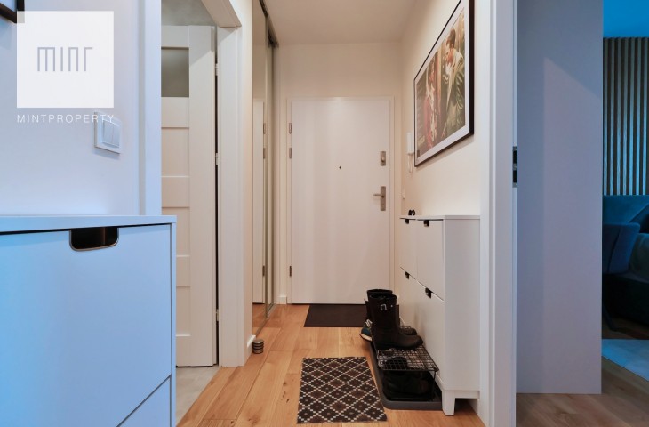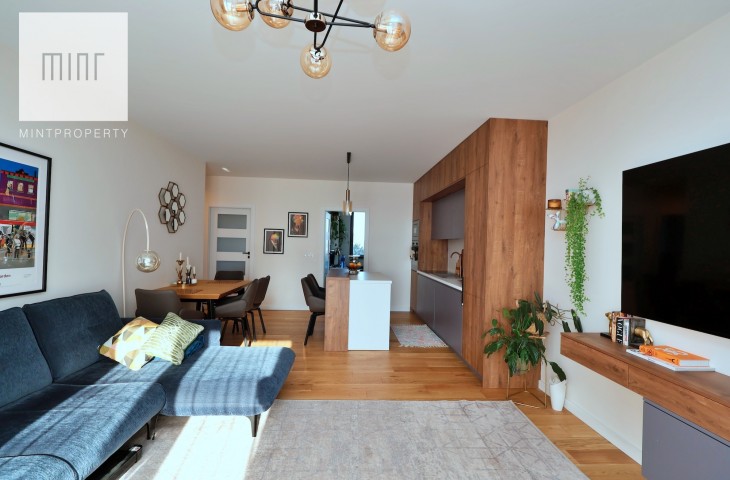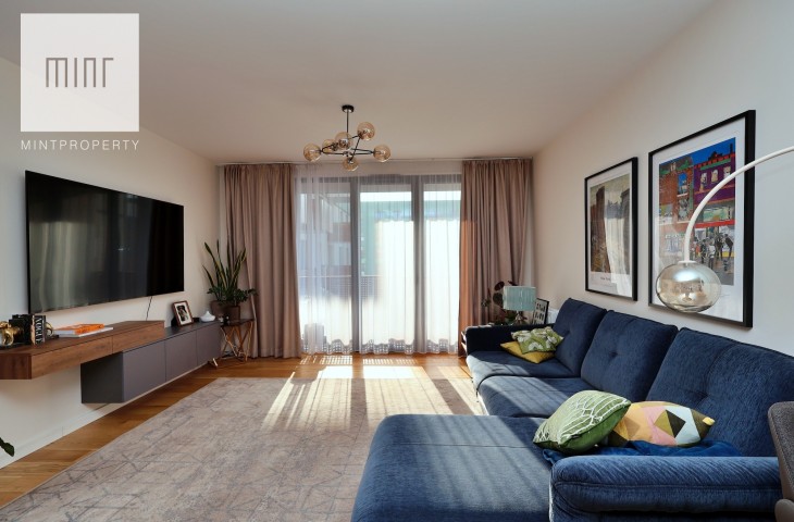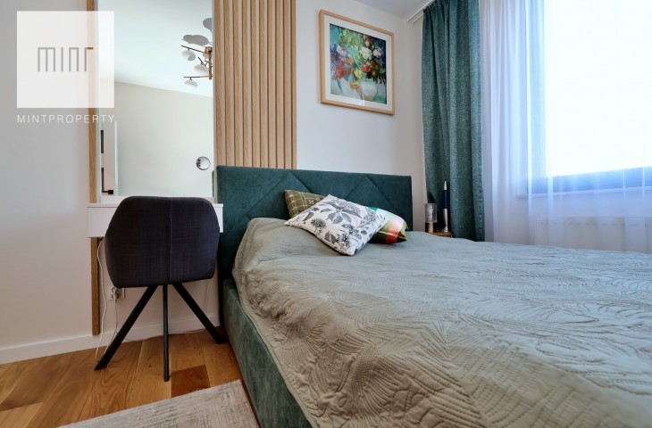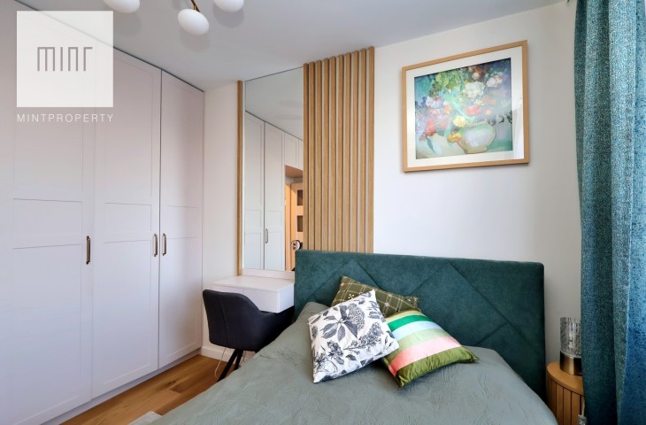 Mieszkanie zostało wykończone z dbałością o każdy detal. Jest w pełni umeblowane i zapewnia maksymalne wykorzystanie przestrzeni, a także spójny design. Na podłodze w salonie i pokojach deska barlinecka.