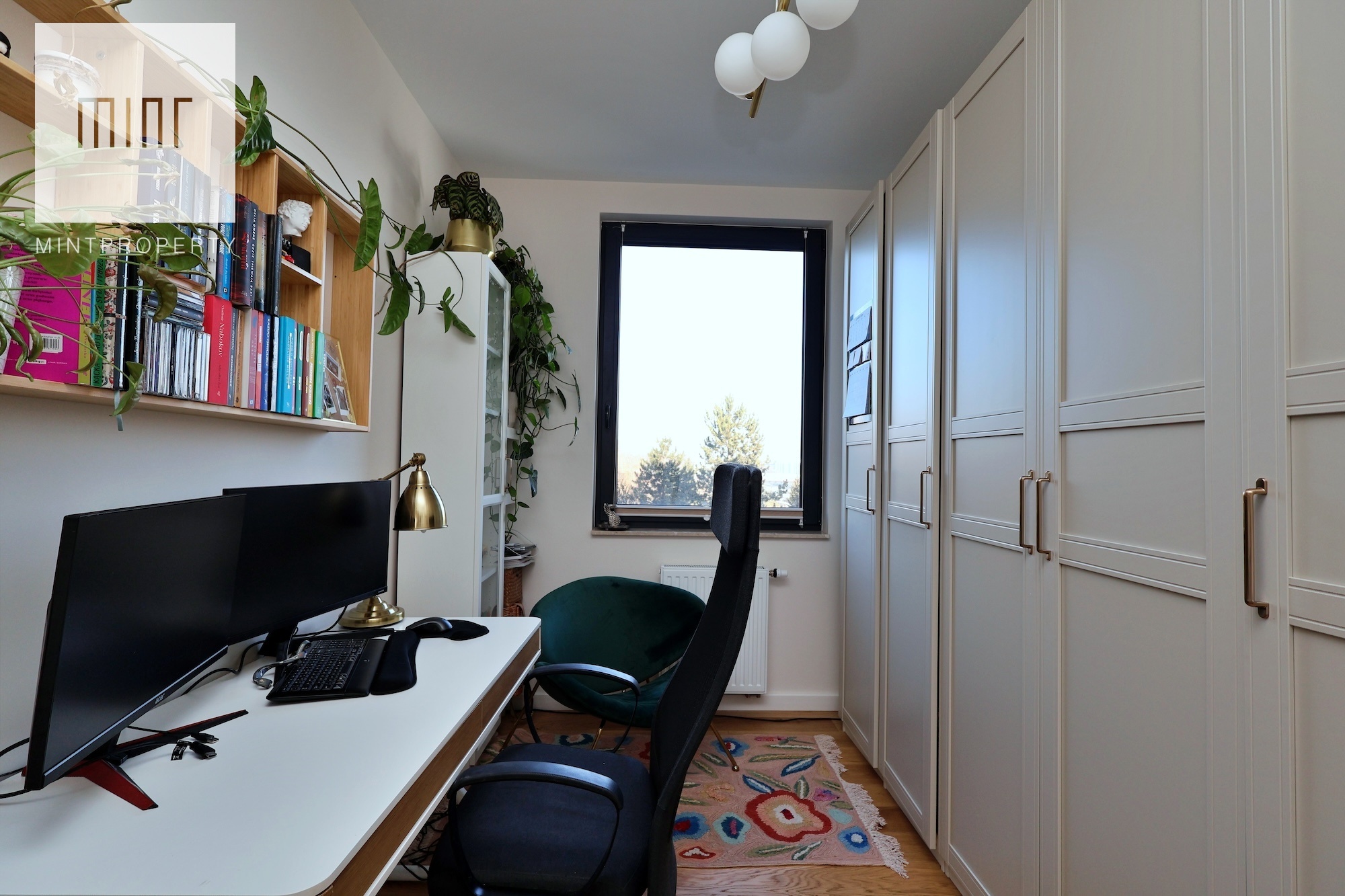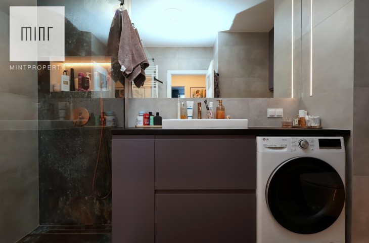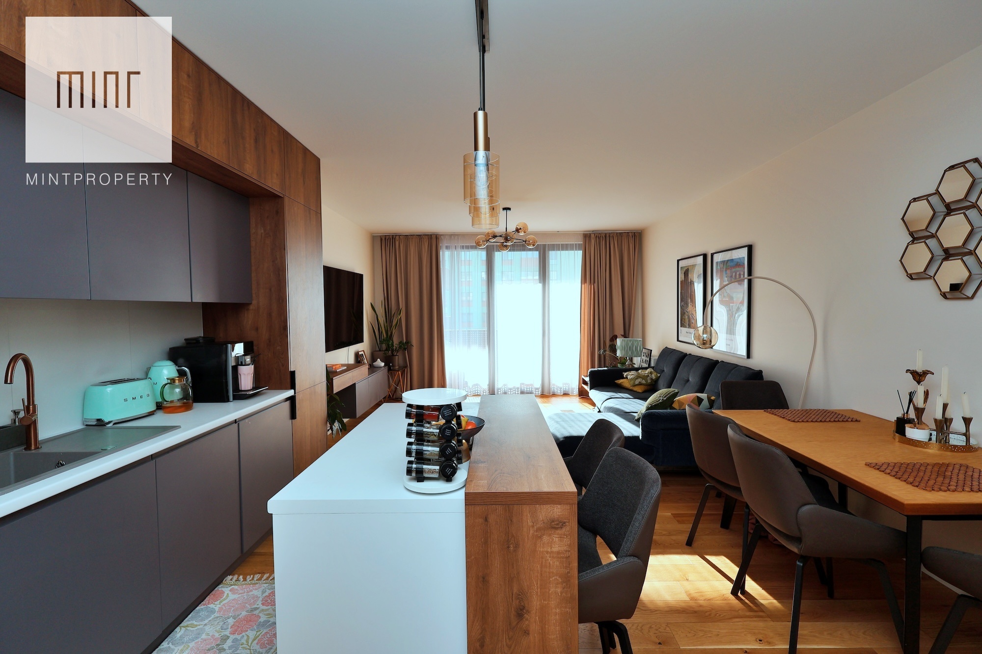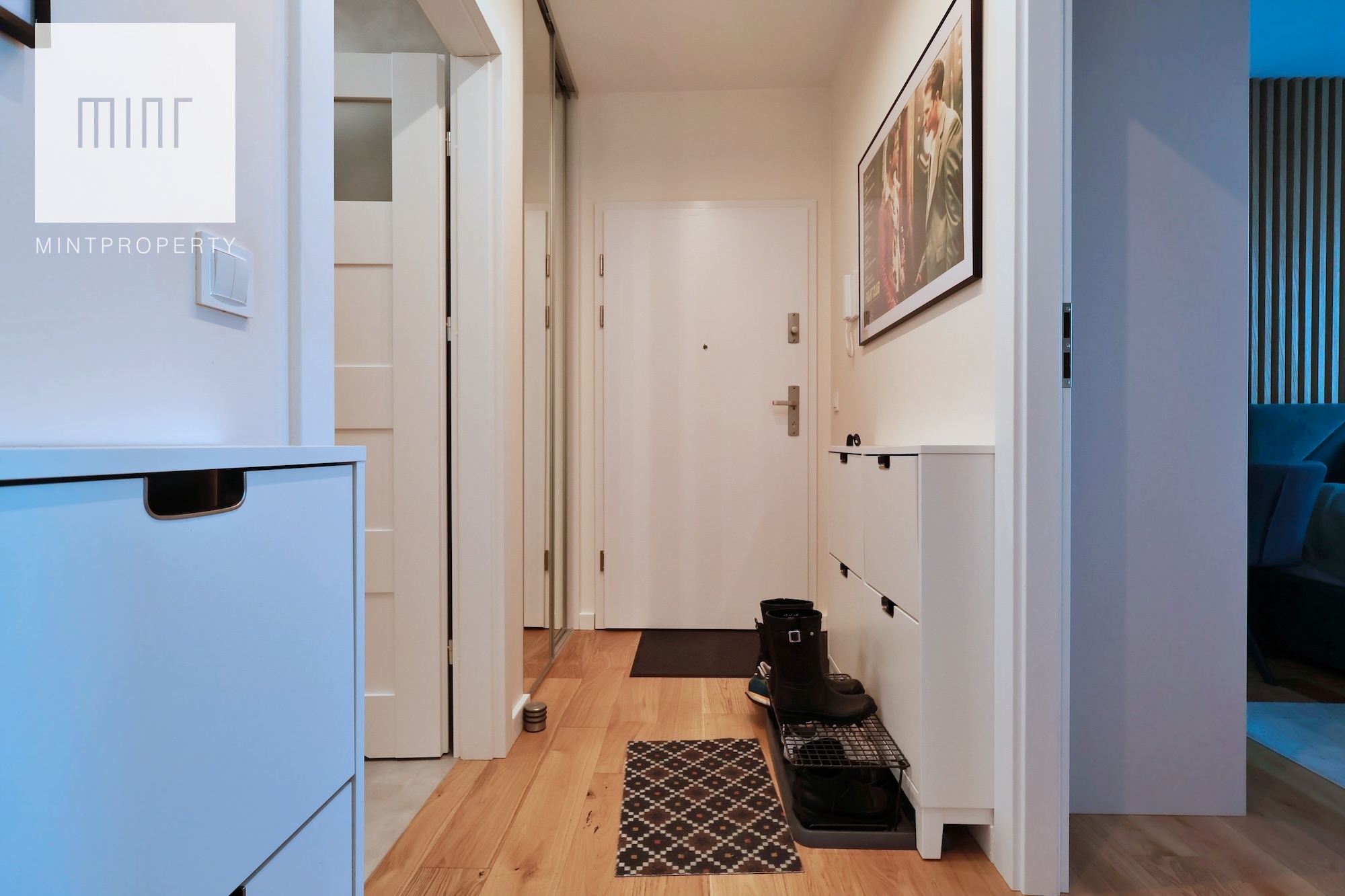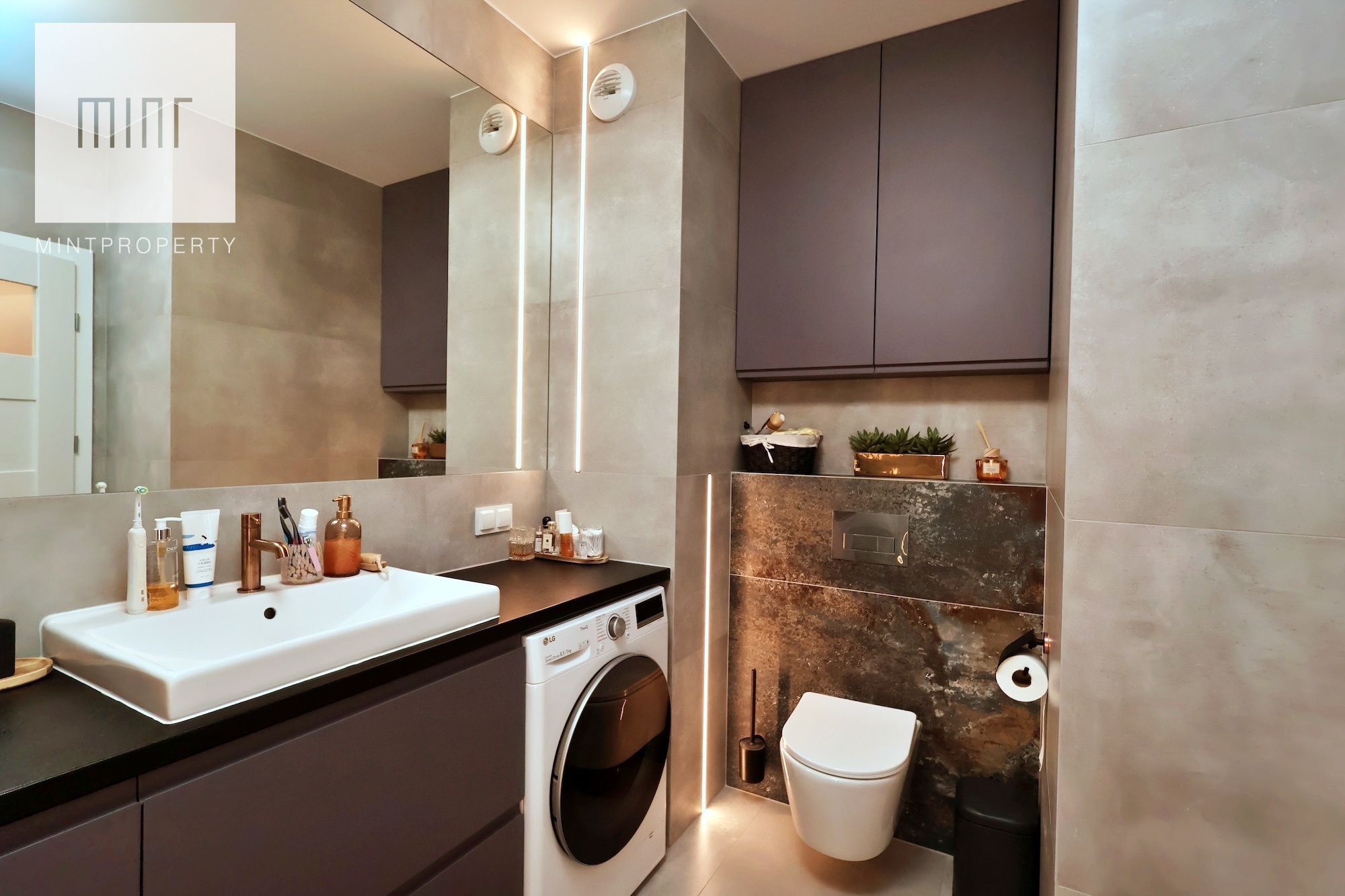 Mieszkanie zostało wykończone z dbałością o każdy detal. Jest w pełni umeblowane i zapewnia maksymalne wykorzystanie przestrzeni, a także spójny design. Na podłodze w salonie i pokojach deska barlinecka.