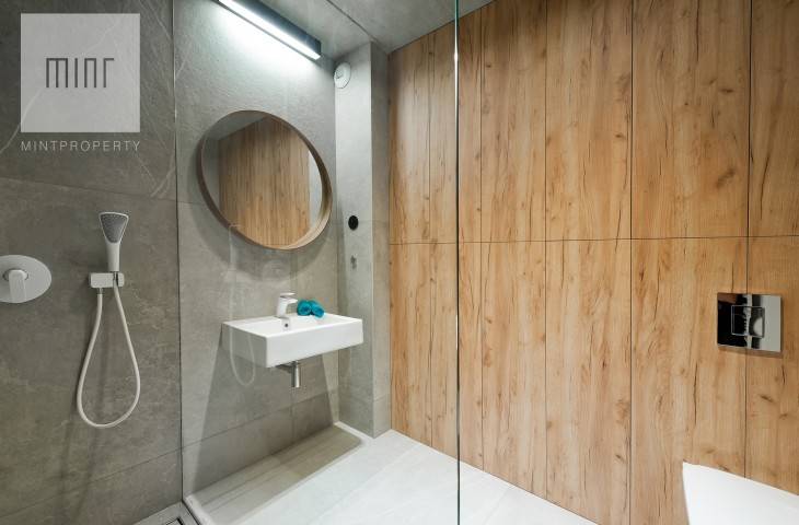 Mieszkanie jest wyposażone w bardzo wysokim standardzie, jednocześnie funkcjonalne. Znajdują się w nim wszystkie potrzebne sprzęty (lodówka, zmywarka, kuchenka indukcyjna, okap, pralka, odkurzacz).