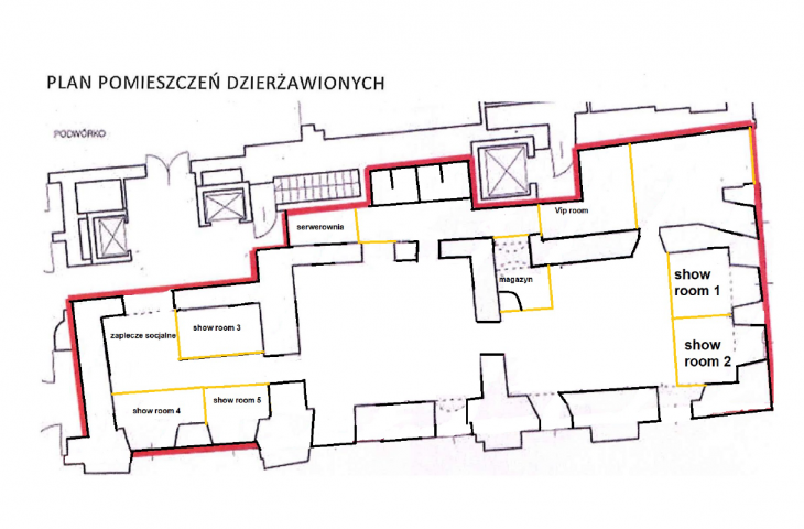 Lokal o powierzchni 250 m2 składa się z pomieszczenia głównego, mniejszych pomieszczeń oraz sanitariatów.
