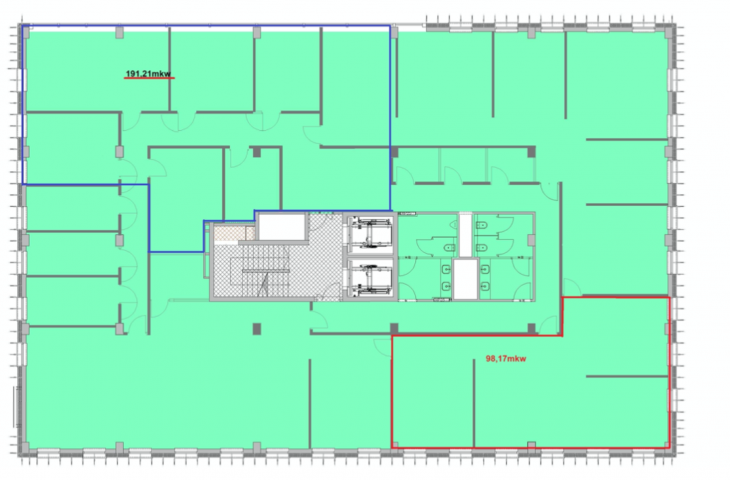 Do dyspozycji Najemcy jest powierzchnia w układzie open spece jak również wydzielonych gabinetów. Duże przeszklenia zapewniają dobre doświetlenie pomieszczeń.