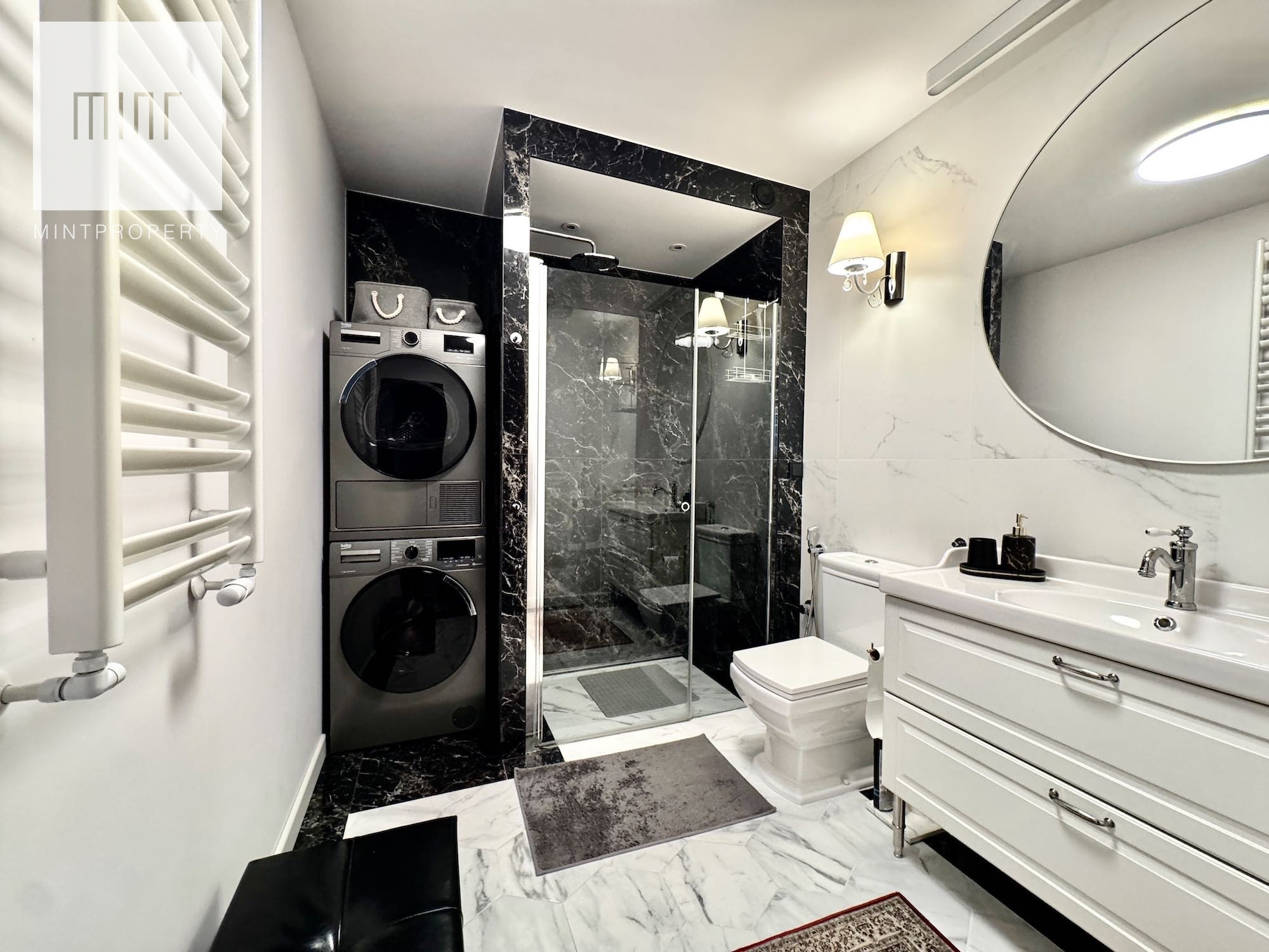 W mieszkaniu znajdują się takie sprzęty jak: piekarnik, mikrofalówka w zabudowie, płyta indukcyjna, zmywarka, pralka, suszarka.