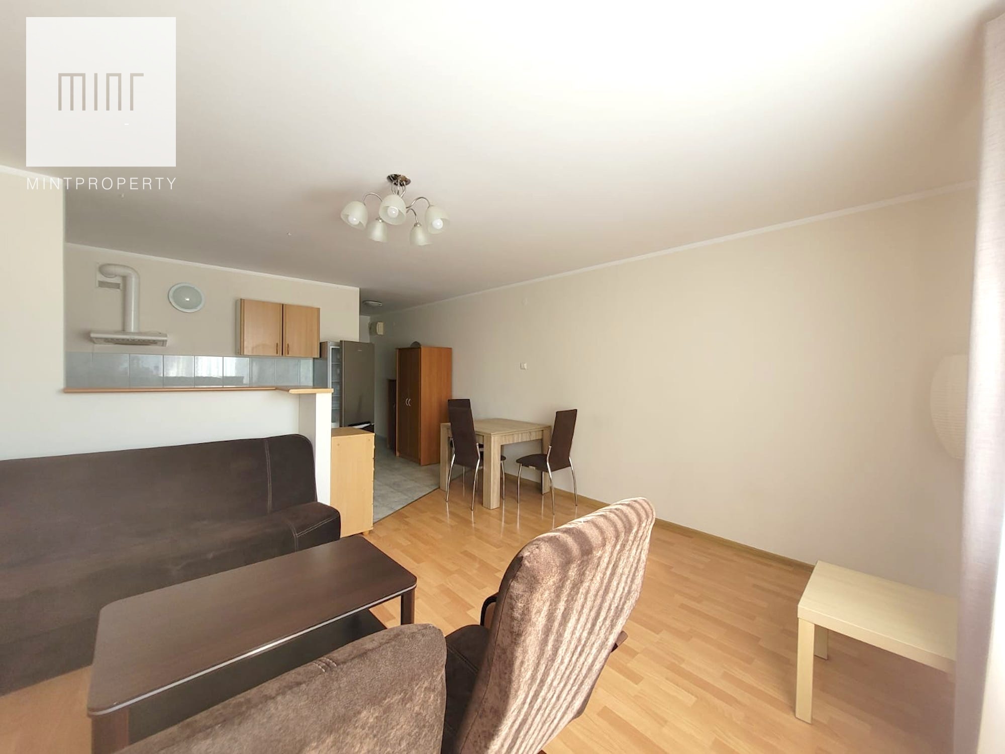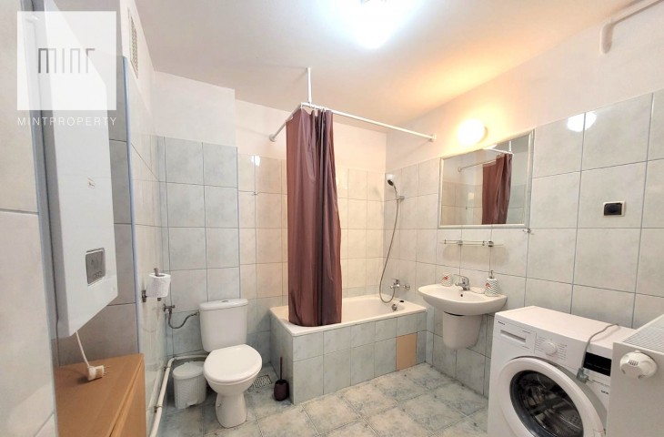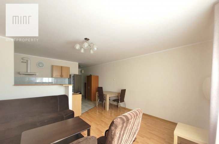 W skład mieszkania wchodzi ustawny pokój połączony a aneksem kuchennym (oddzielony wysokim barkiem) oraz balkon. W łazience wanna i pralka.