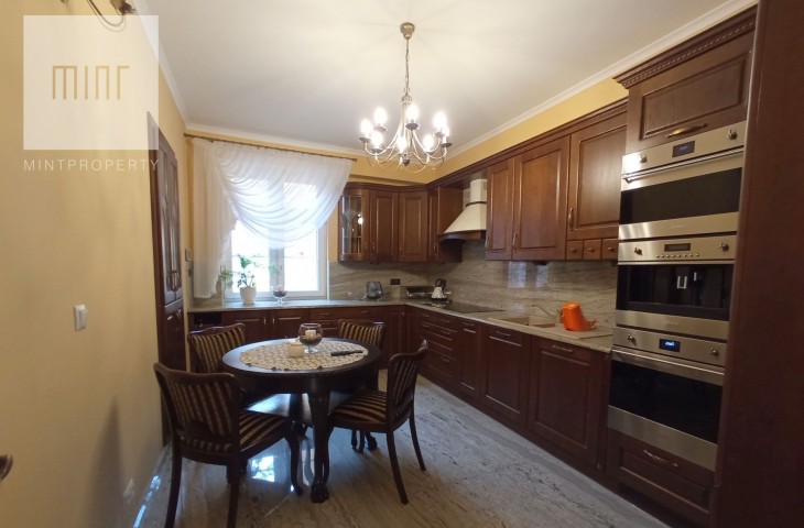 W kuchni wykonanej na zamówienie kompletne wyposażenie: sprzęty AGD najwyższej klasy (SMEG), granitowe blaty, zestaw porcelanowych zastaw jak i osprzęt kuchenny (garnki, talerze, szklanki, sztućce).