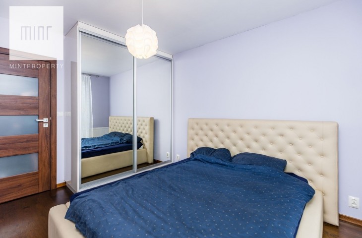 Sypialnia jest wyposażona w łóżko 160 cm oraz bardzo pojemną szafa w zabudowie,na całą szerokość ściany.