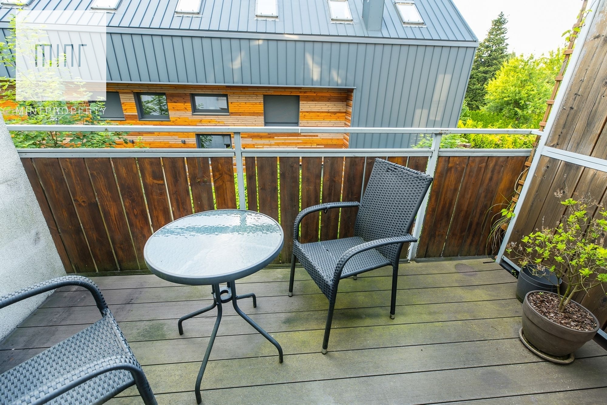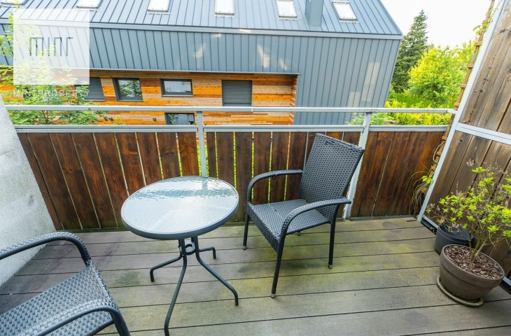 W salonie znajduje się wyjście na przestronny balkon z wiodkiem na zieleń.
