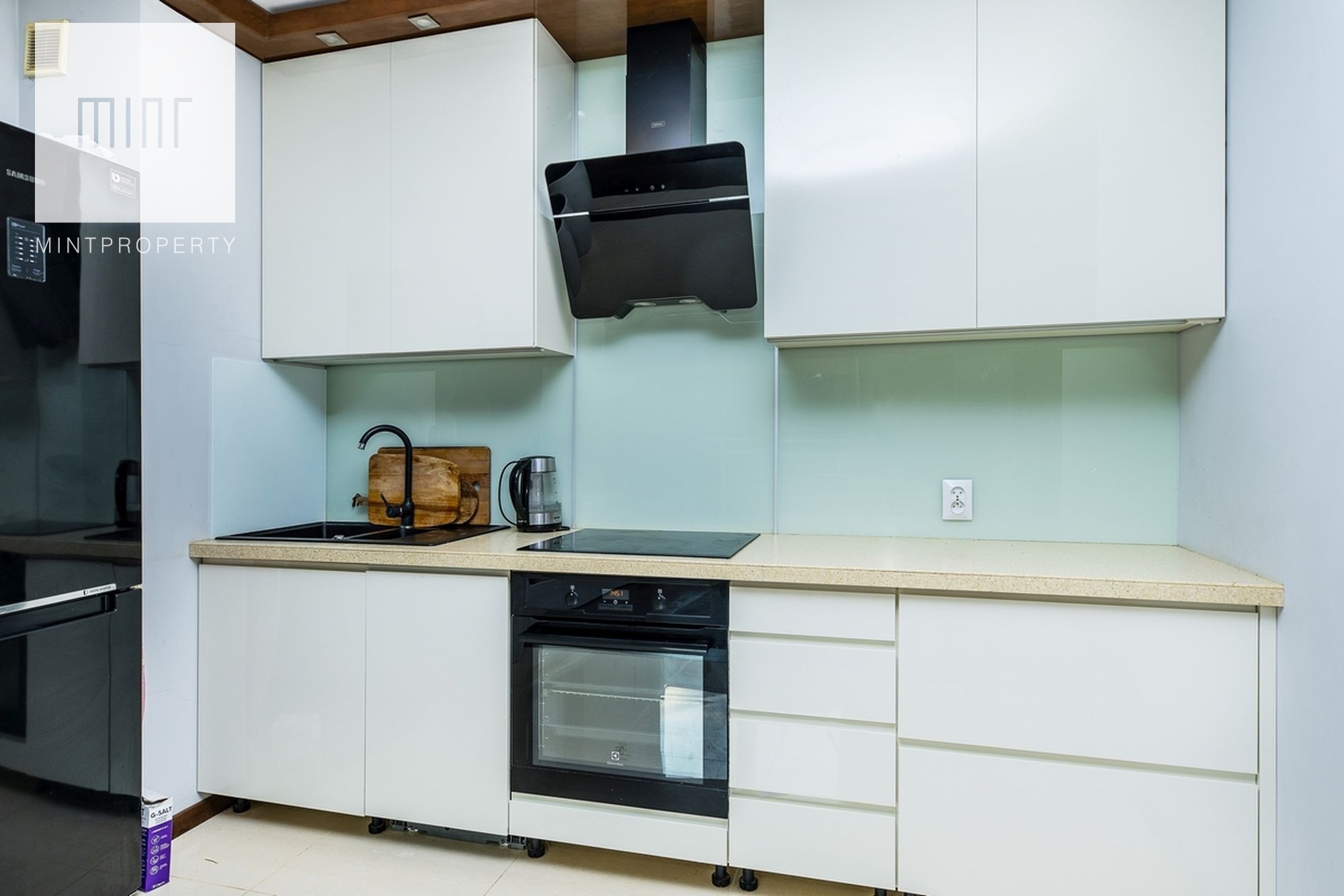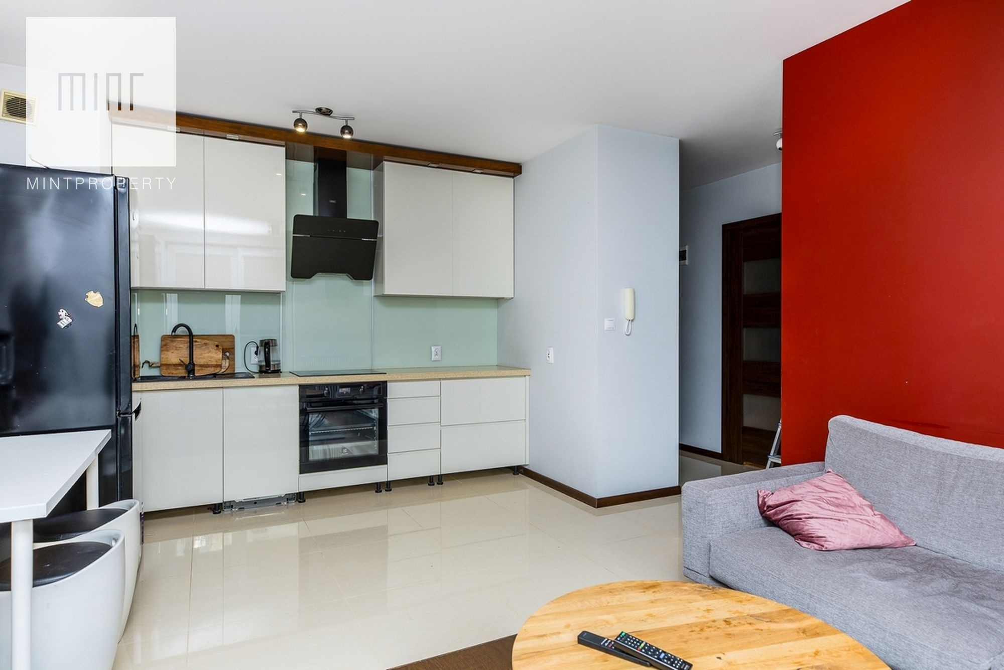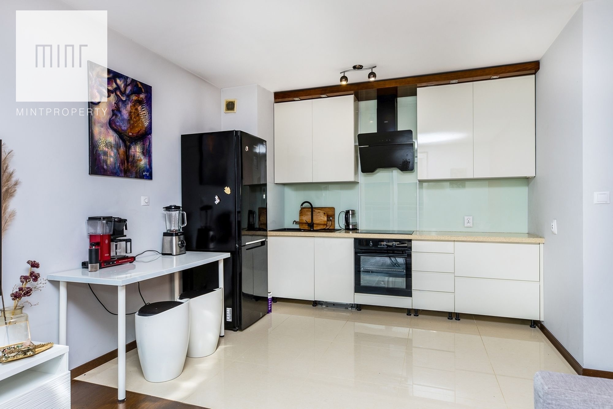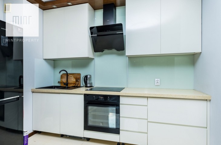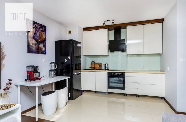 Kuchnia zawiera wszystkie niezbędne sprzęty takie jak: zmywarka, kuchenka, kuchnia indukcyjna w zabudowie oraz lodówkę. Pojemne i duże szafki i szuflady z cichym domykiem.