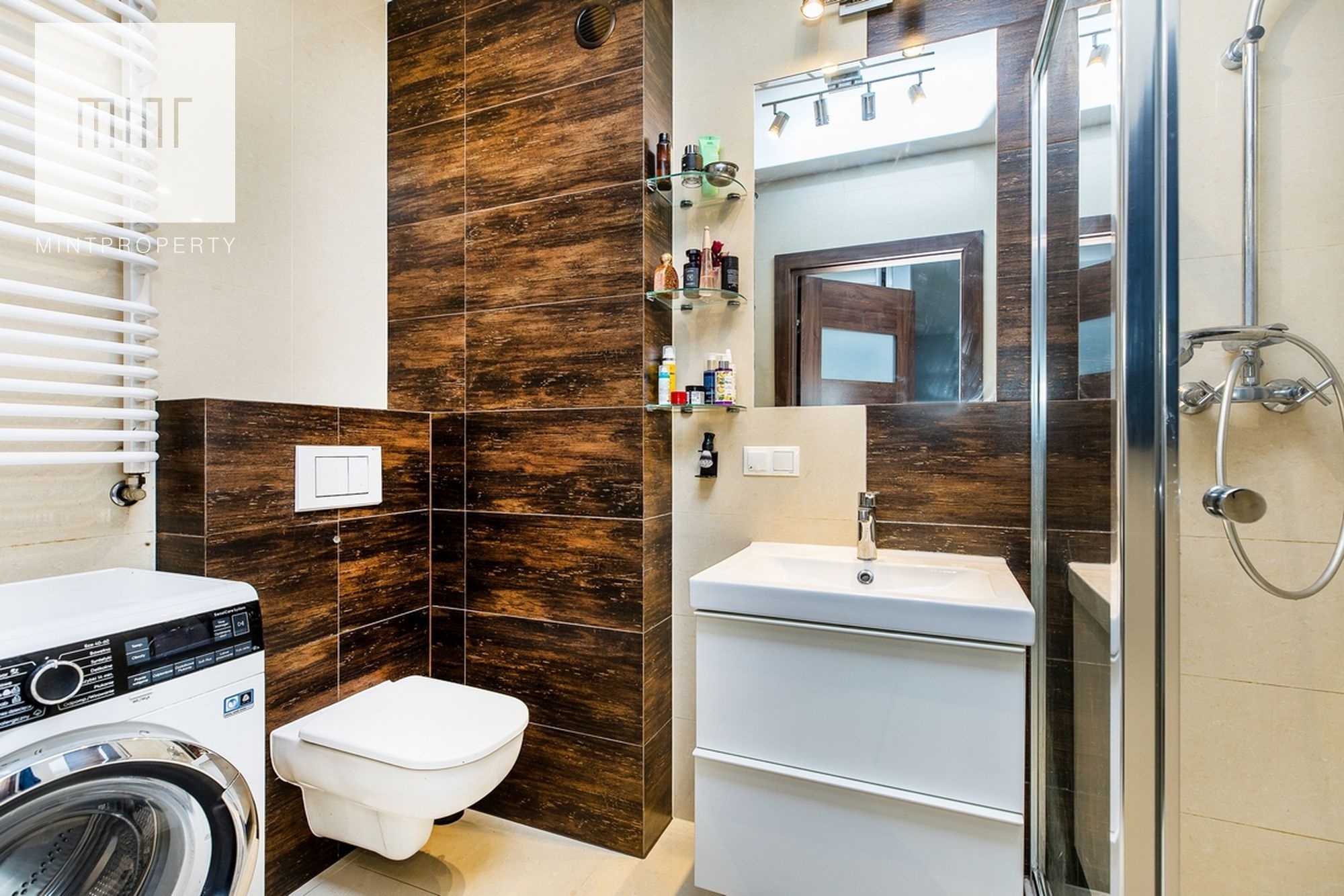 Łazienka wyposażona w pralkę oraz pojemnne szafki.