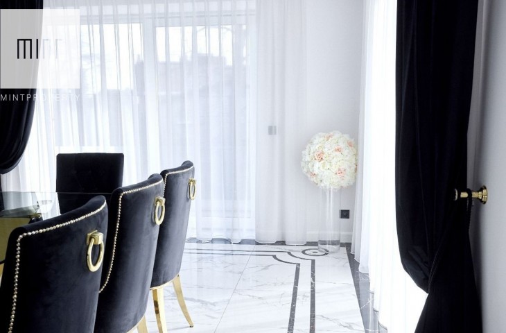 Dom wykończony jest w wysokim standardzie – klamki do mebli ozdobione kryształami Swarovskiego, wysokiej jakości firany i zasłony w oknach. Z okien sypialni rozciąga się piękny widok na park.