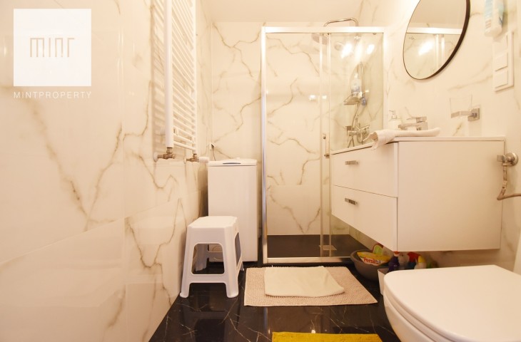 Łazienka z WC: prysznic, pralka.