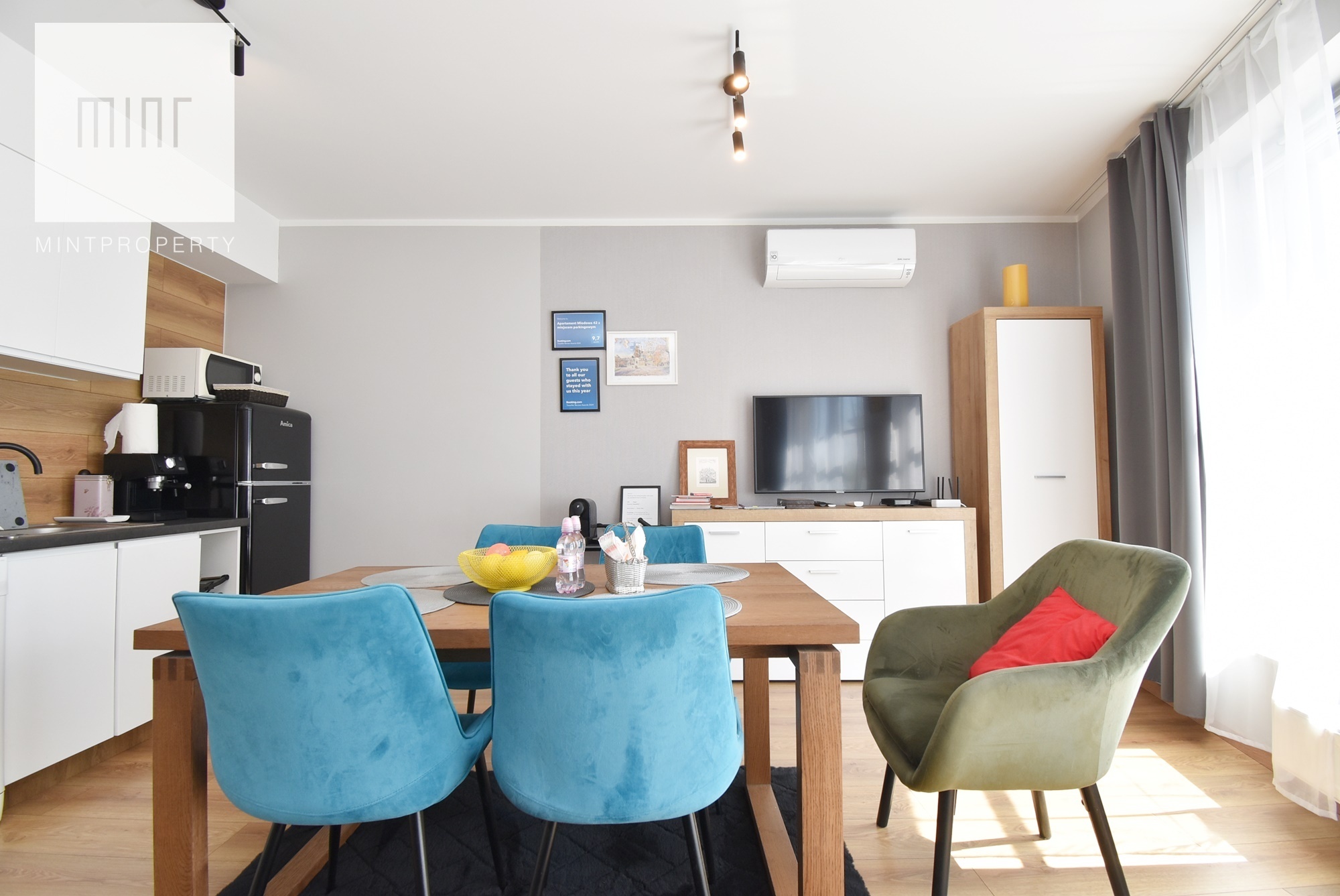 Kuchnia w pełni wyposażona: zmywarka, płyta elektryczna, kuchenka mikrofalowa, ekspres do kawy, toster, czajnik, lodówka itd., a także naczynia, sztućce, garnki, kubki, szklanki itp.