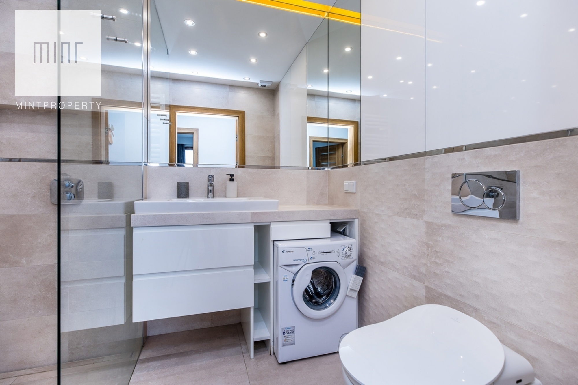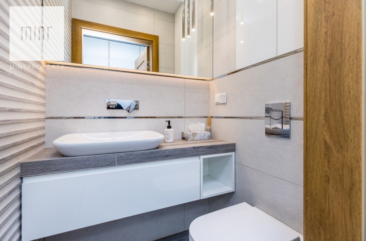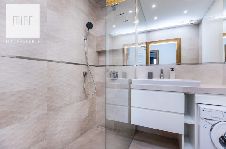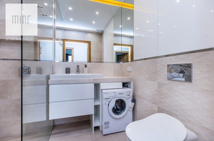 Mieszkanie zostało wykończone w najwyższym standardzie i wyposażone we wszystkie niezbędne sprzęty AGD, takie jak: pralka, lodówka z zamrażarką, zmywarka, piekarnik.