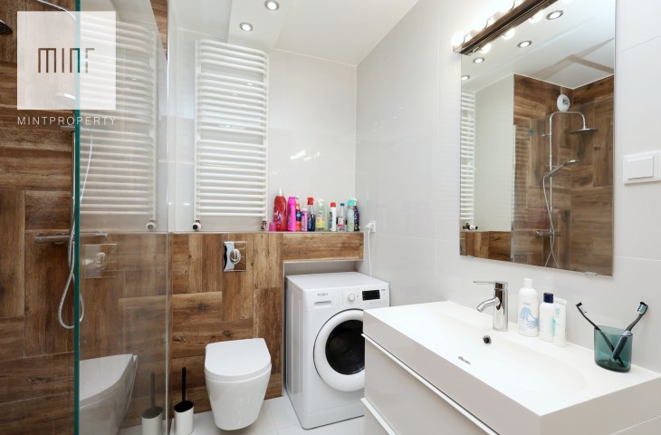 Mieszkanie zostało wykończone z dbałością o jakość i funkcjonalność – kuchnia wyposażona jest w zmywarkę, lodówkę, płytę indukcyjną, okap.