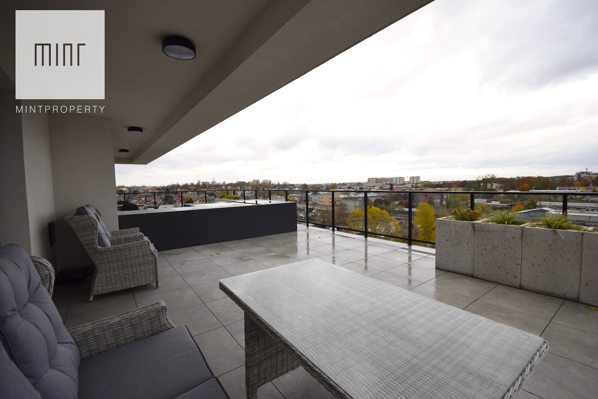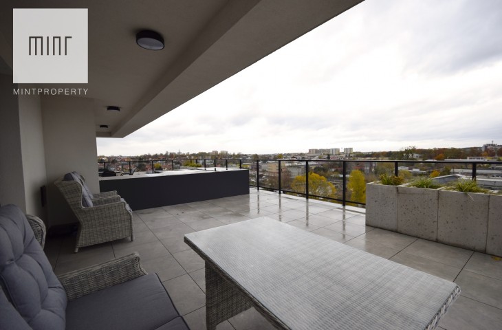 Biuro Nieruchomości MINT Property prezentuje do wynajęcia nowy, w pełni umeblowany apartament typu penthouse o powierzchni 64m² z dużym tarasem (71m²), komórką lokatorską i miejscem postojowym w hali garażowej.
