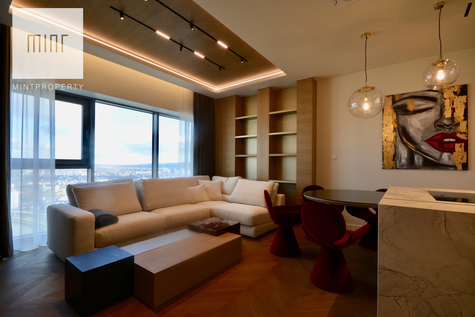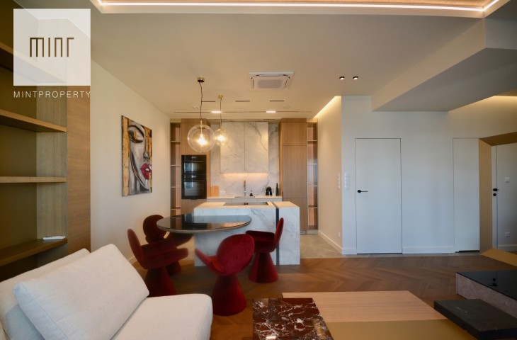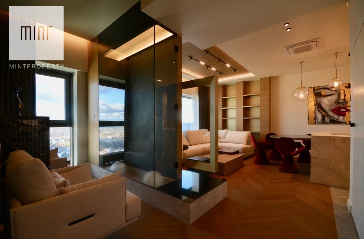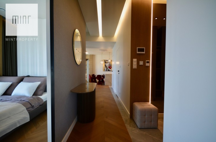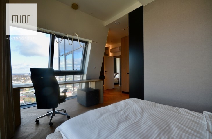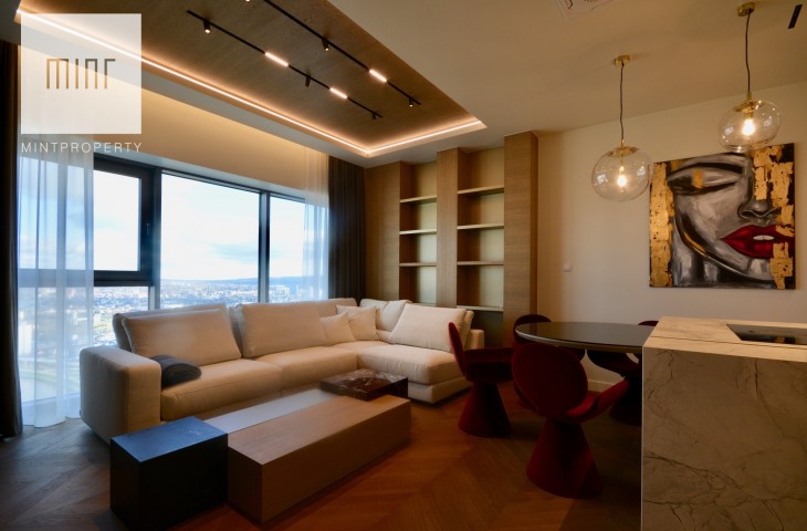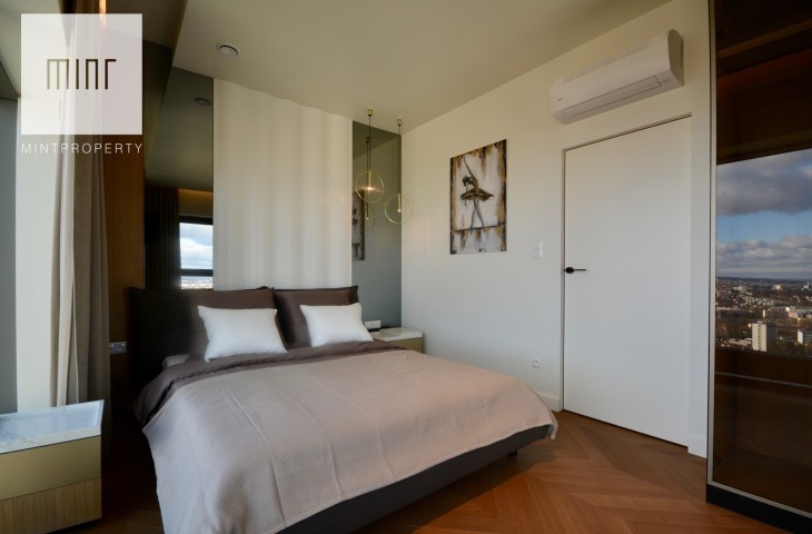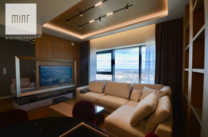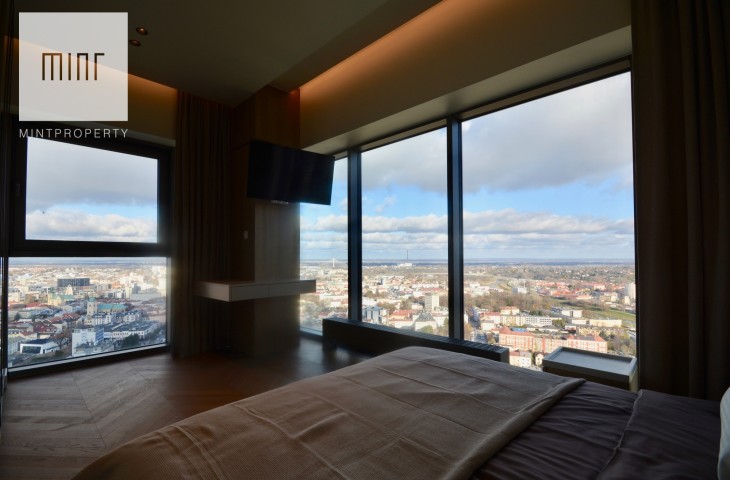 Apartament o powierzchni 88,44m2 m2 składa się z salonu połączonego z aneksem kuchennym, dwóch oddzielnych sypialni, strefy wypoczynkowej, pomieszczenia gospodarczego, w którym mamy do dyspozycji pralkę oraz suszarkę, łazienki, wiatrołapu oraz korytarza. Do mieszkania przynależy komórka lokatorska o powierzchni 3,28m2 oraz miejsce postojowe w garażu podziemnym. Nieruchomość usytuowana jest na 30 piętrze z przepięknym widokiem na panoramę miasta. Apartament znajduje się w bardzo prestiżowym, i zarazem najwyższym budynku mieszkalnym w Polsce!