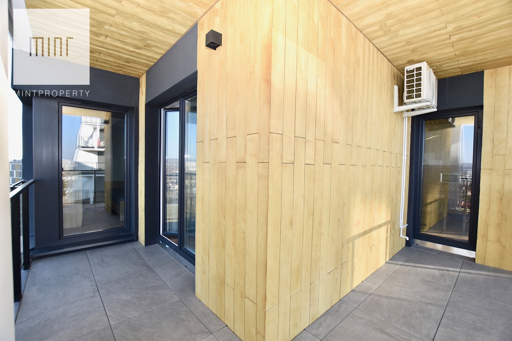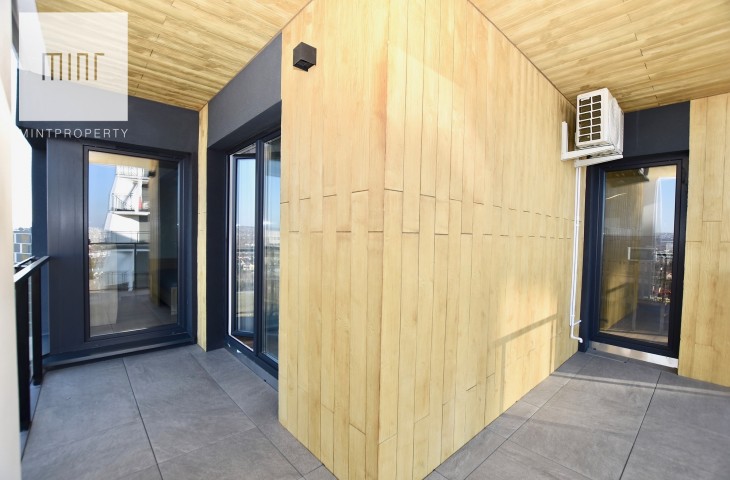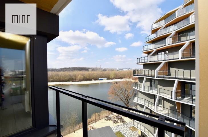 Mieszkanie o powierzchni 46,2 m2 usytuowane jest na 5 piętrze i składa się z pokoju dziennego połączonego z aneksem kuchennym, przestronnej sypialni, garderoby, łazienki oraz przedpokoju. Do mieszkania przynależy narożna loggia z pięknym widokiem na panoramę miasta oraz Żwirownię. Mieszkanie klimatyzowane.